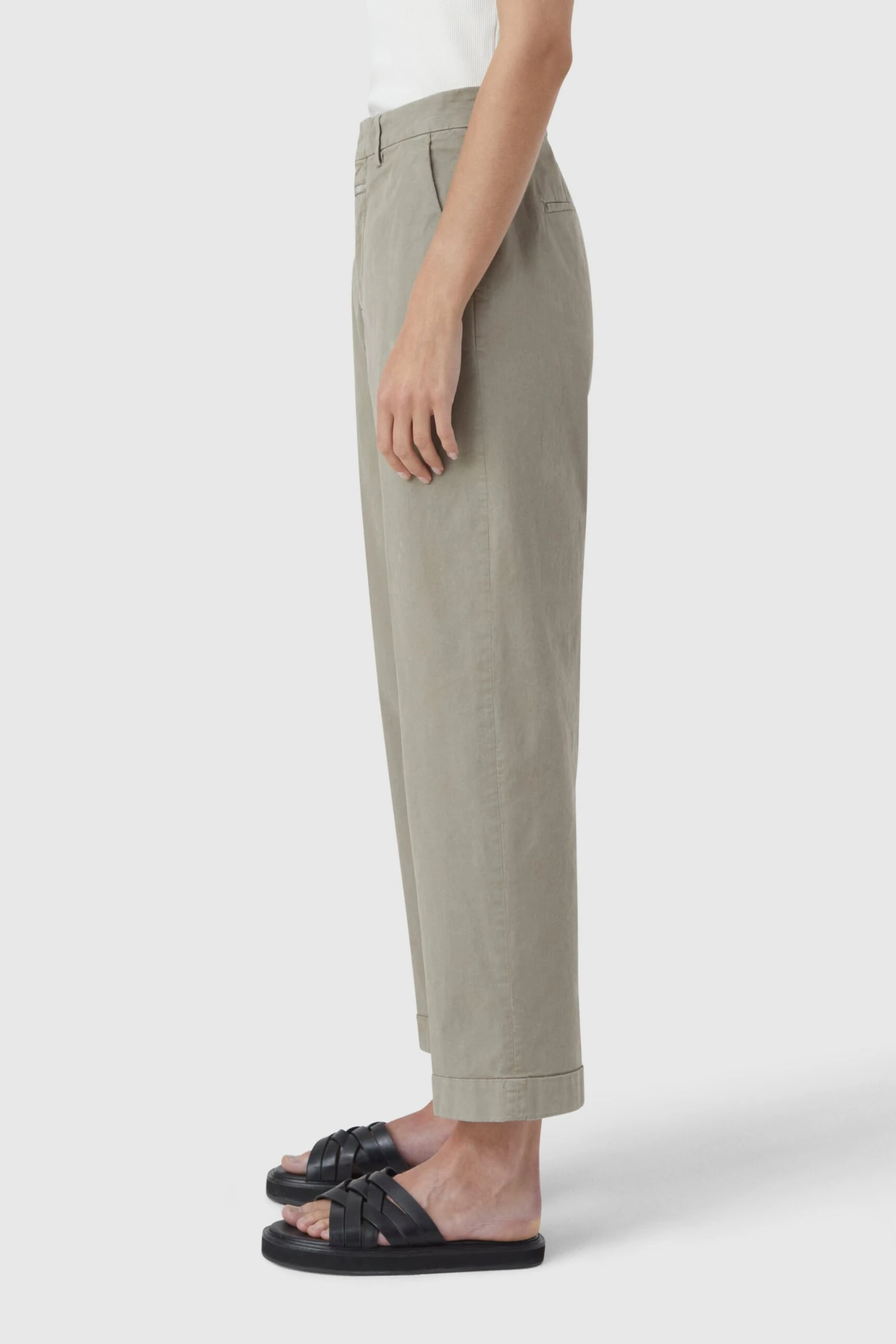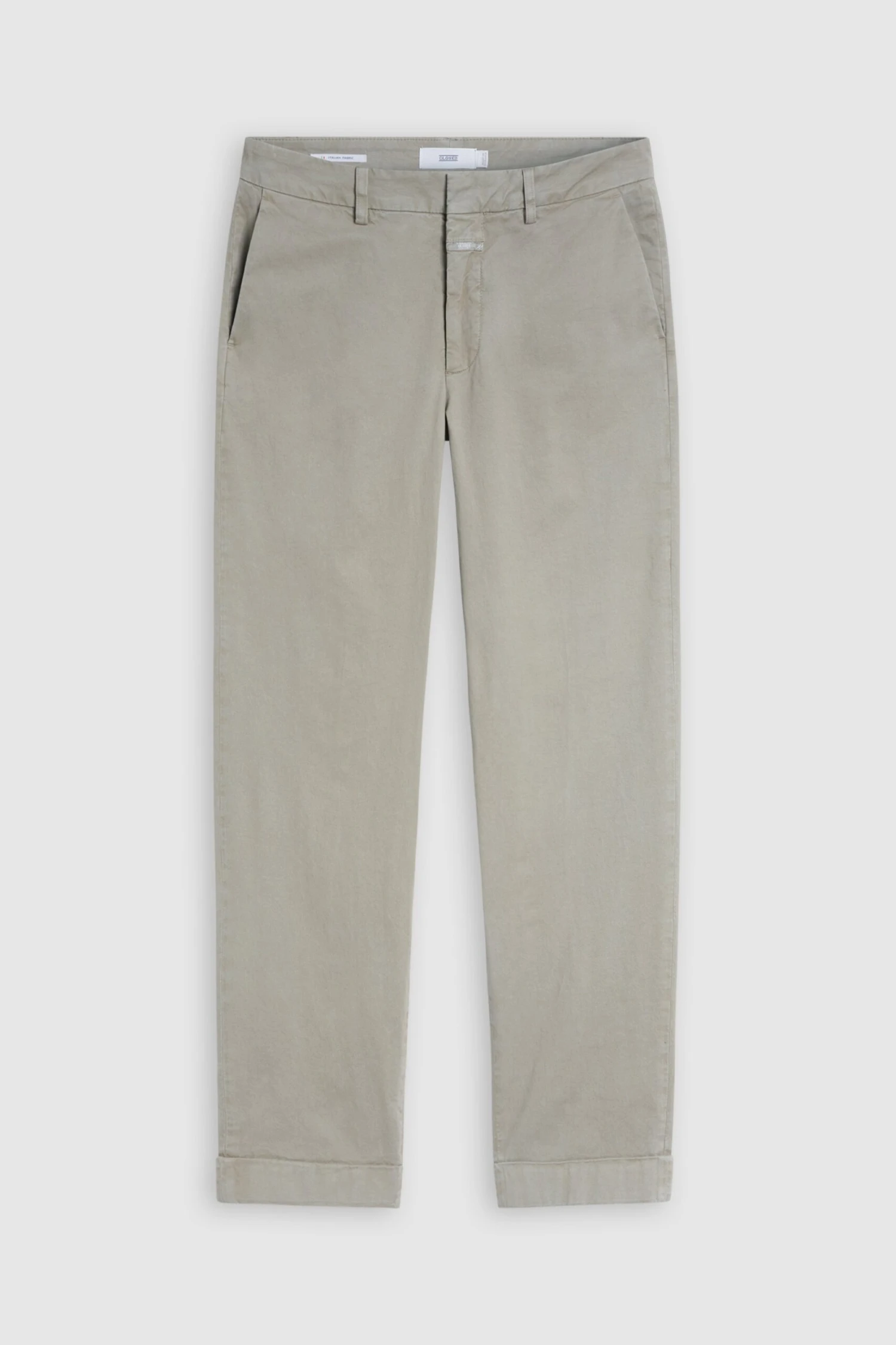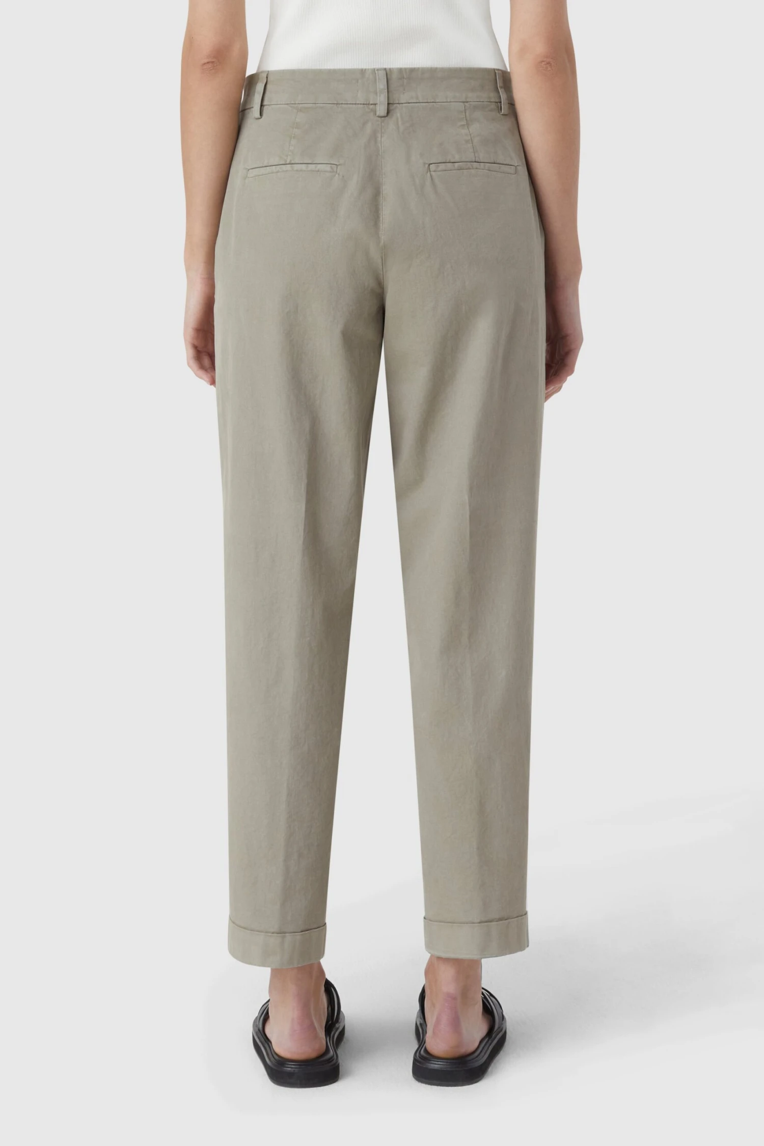 Zu 100 Prozent in Europa gefertigt: New Relaxed Fit mit hohem Bund und geradem Beinverlauf in verkürzter Länge. Gefertigt aus weichem italienischem Baumwoll-Twill mit feiner Struktur und Stretch-Anteil.