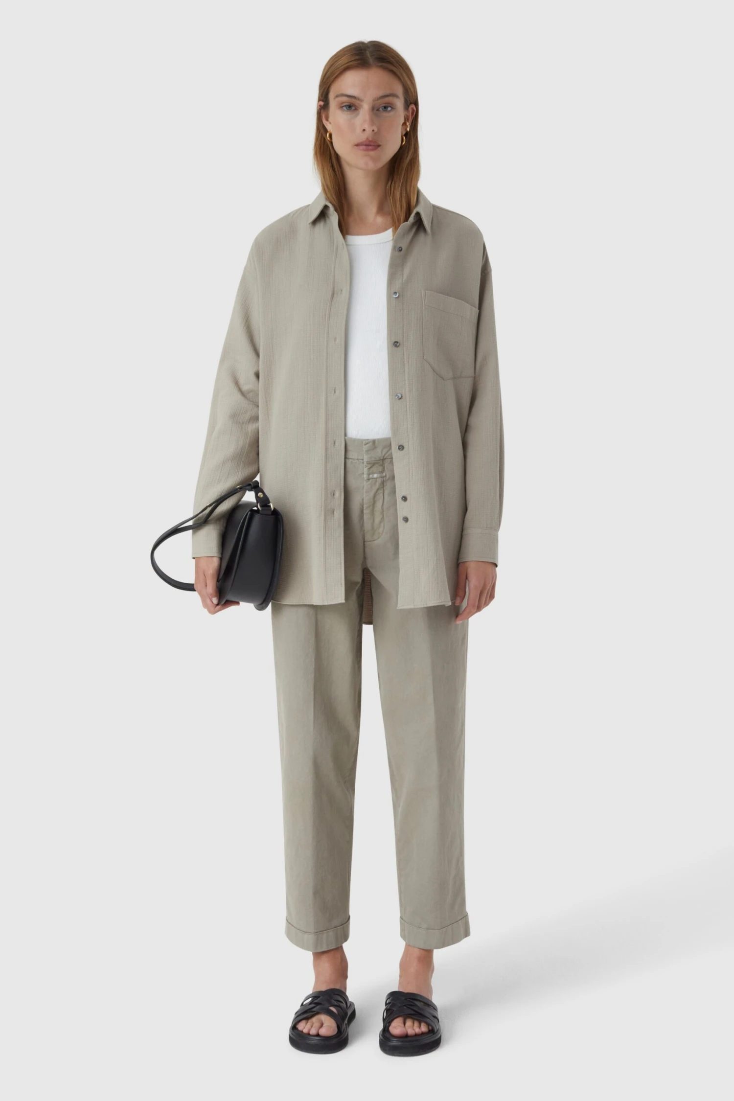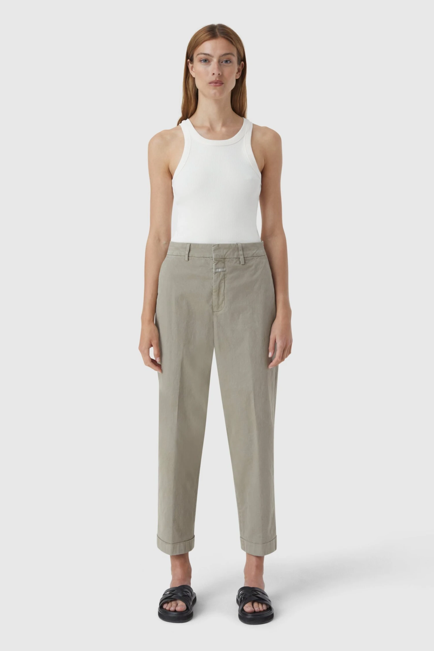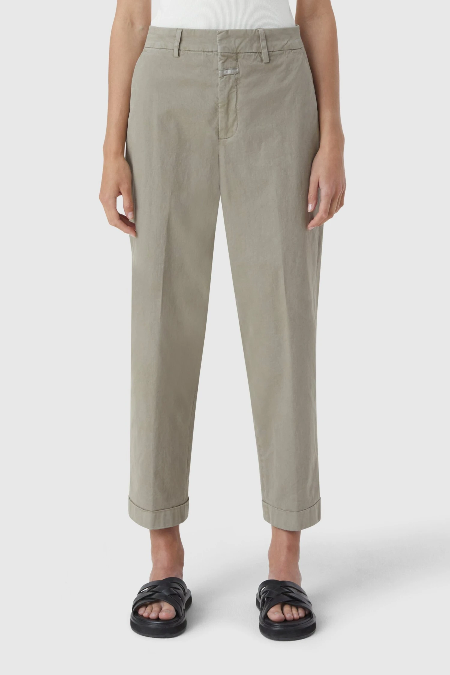 Zu 100 Prozent in Europa gefertigt: New Relaxed Fit mit hohem Bund und geradem Beinverlauf in verkürzter Länge. Gefertigt aus weichem italienischem Baumwoll-Twill mit feiner Struktur und Stretch-Anteil.