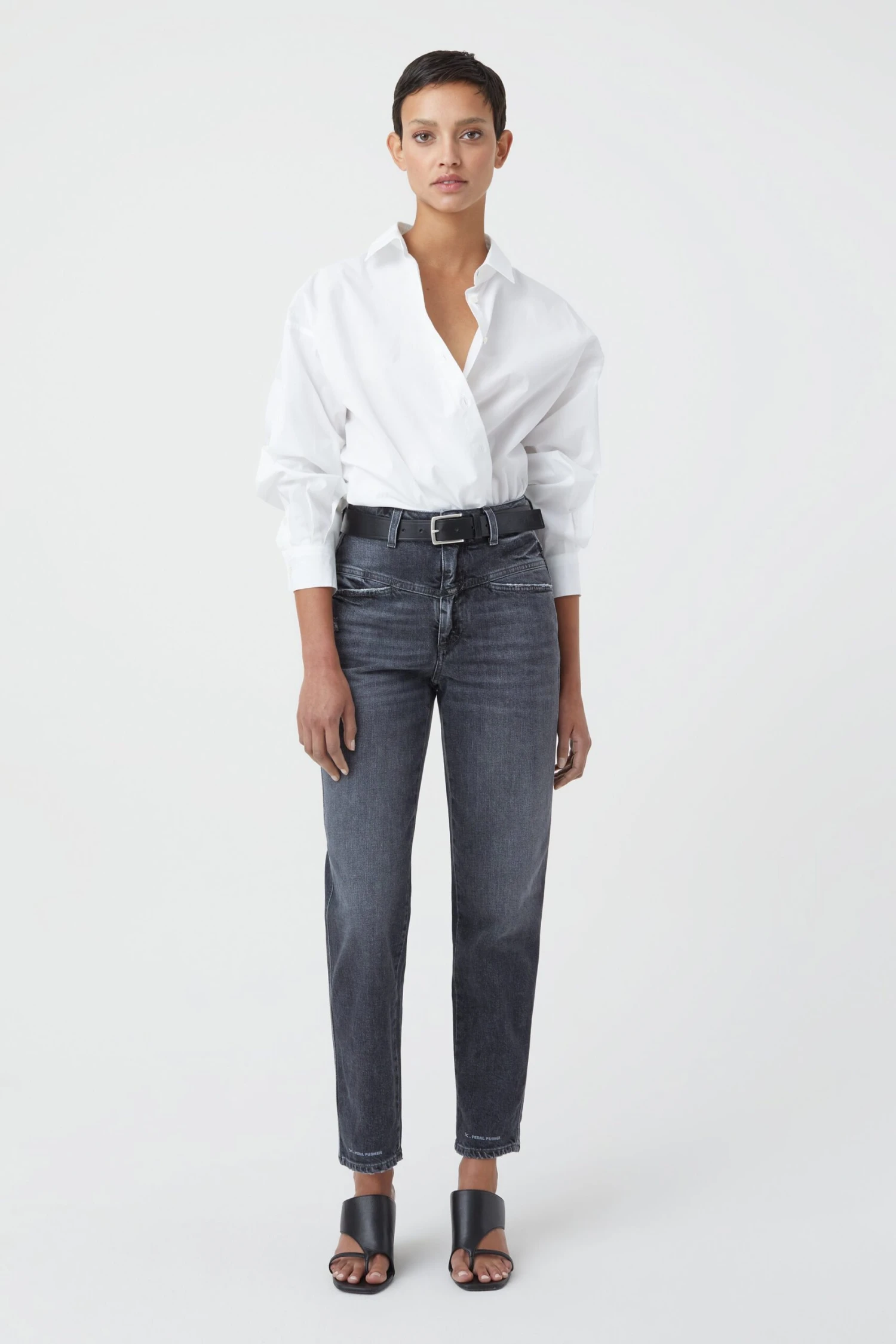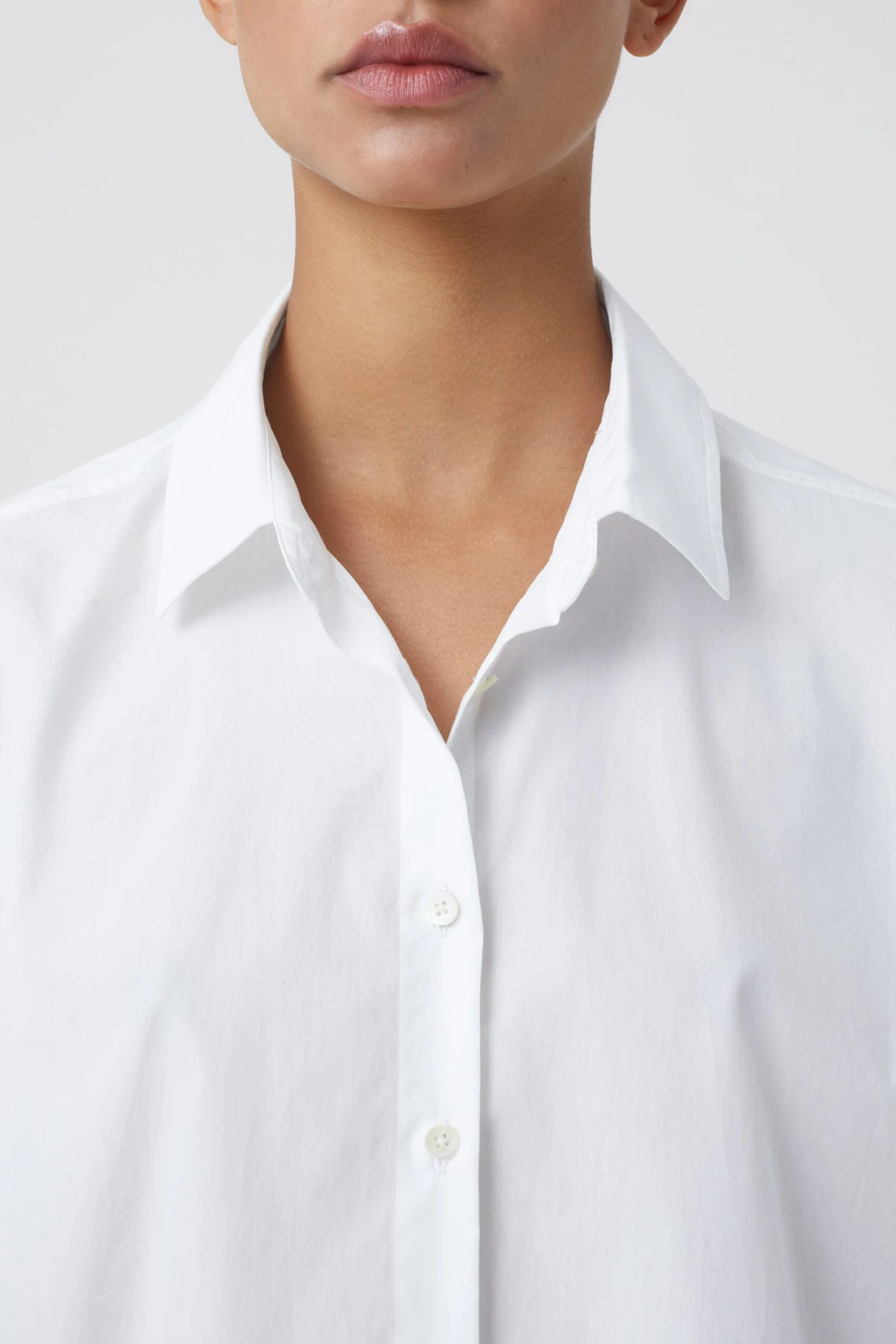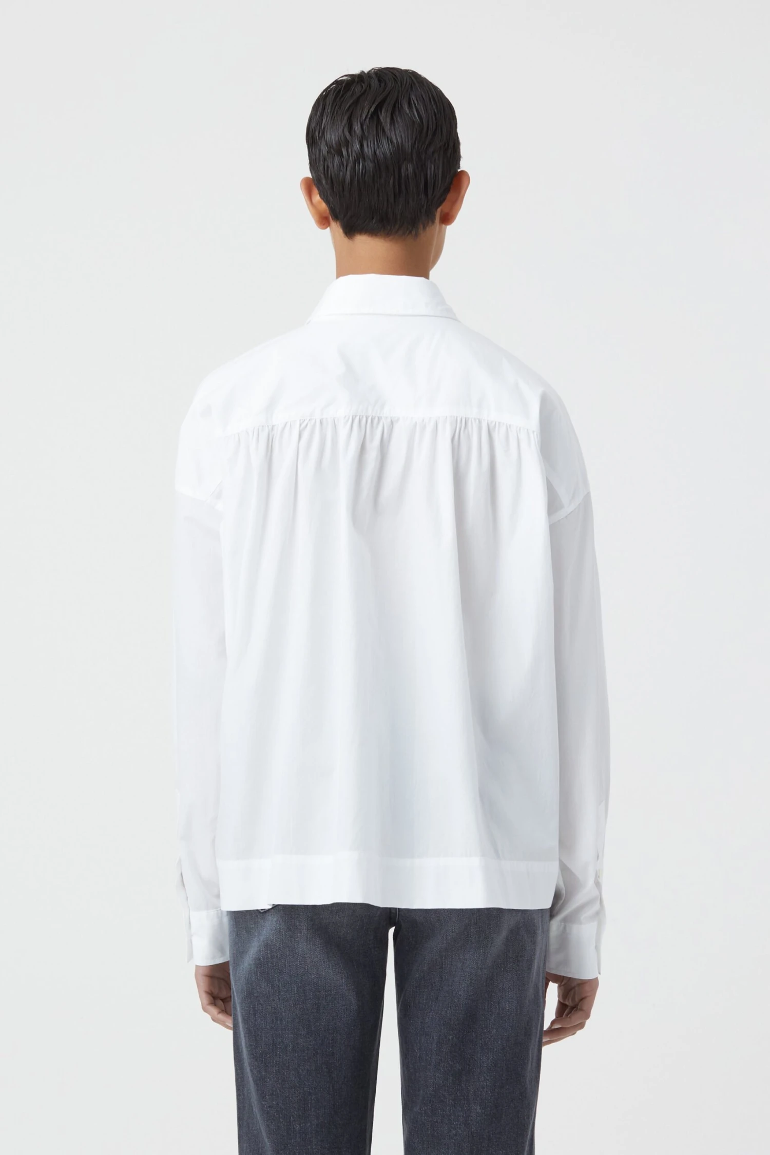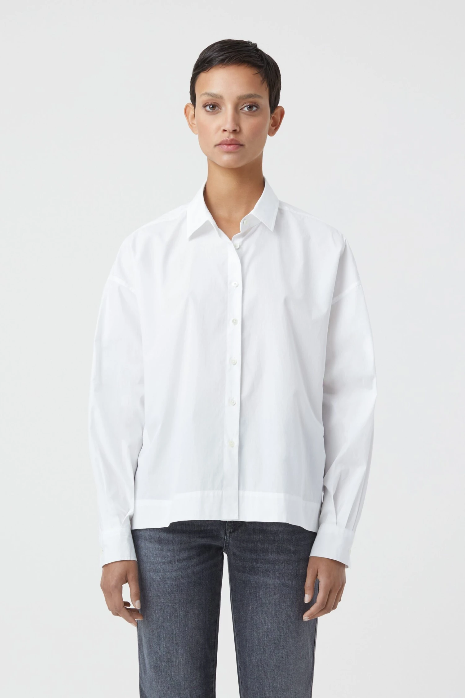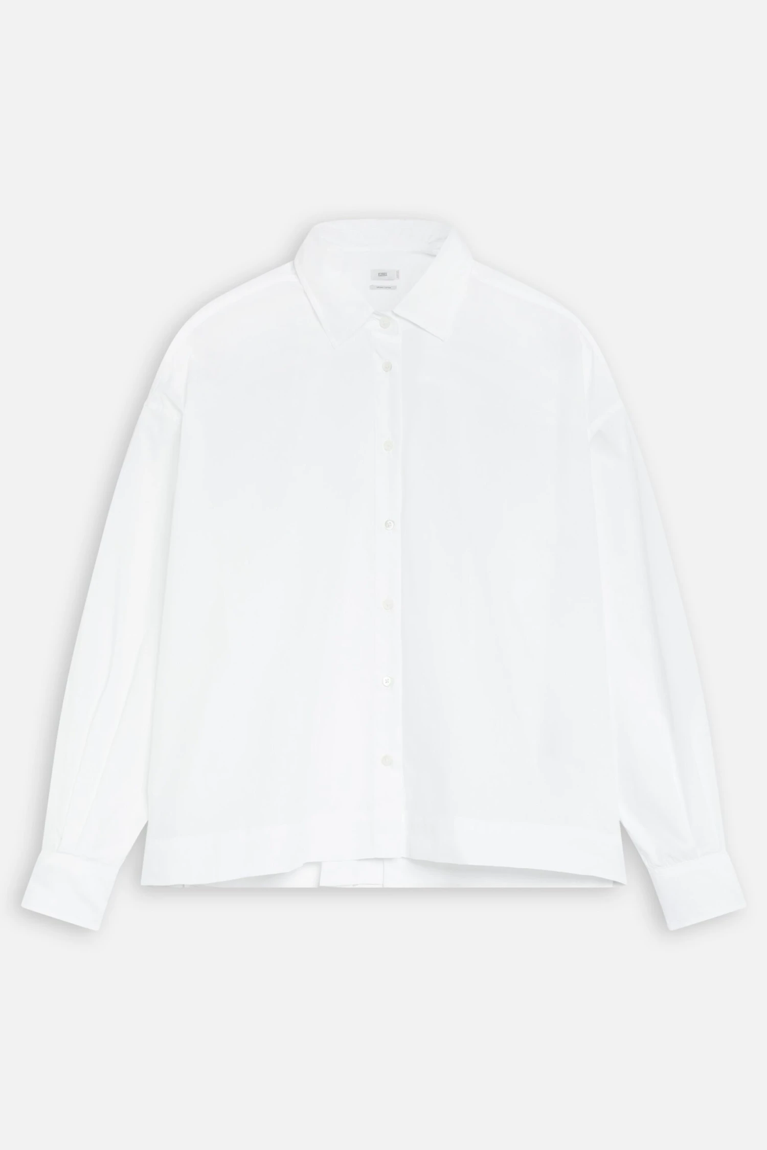 Aus leichtem portugiesischem Popeline gefertigt: Bluse im A-Shape mit Falten am Rückteil, leicht überschnittener Schulter und langen Ärmeln mit Manschetten und Perlmuttknöpfen.
