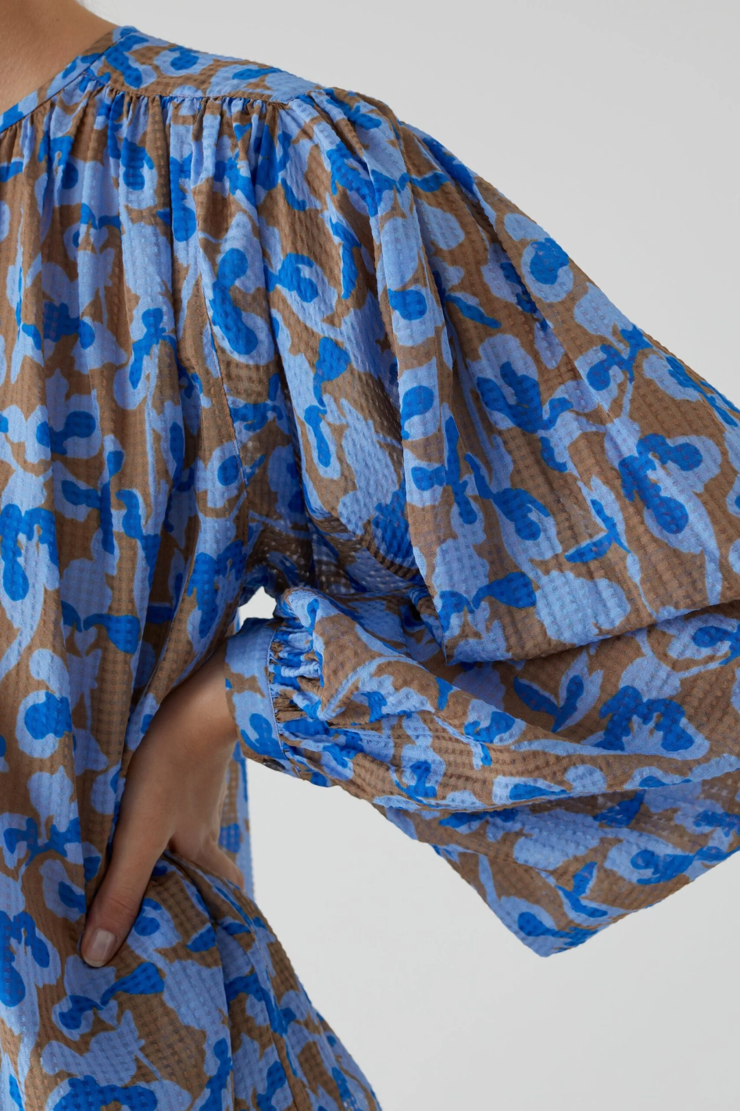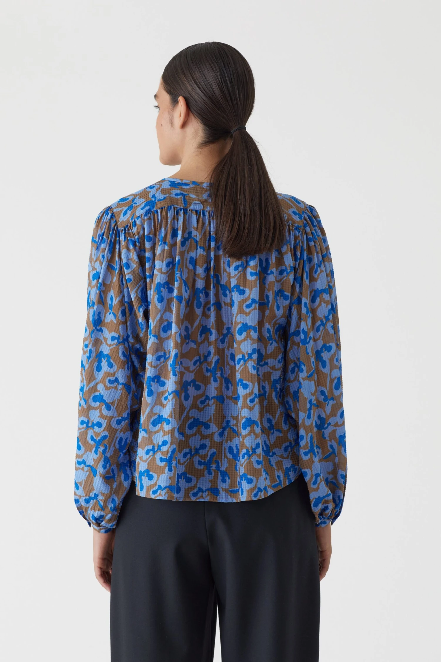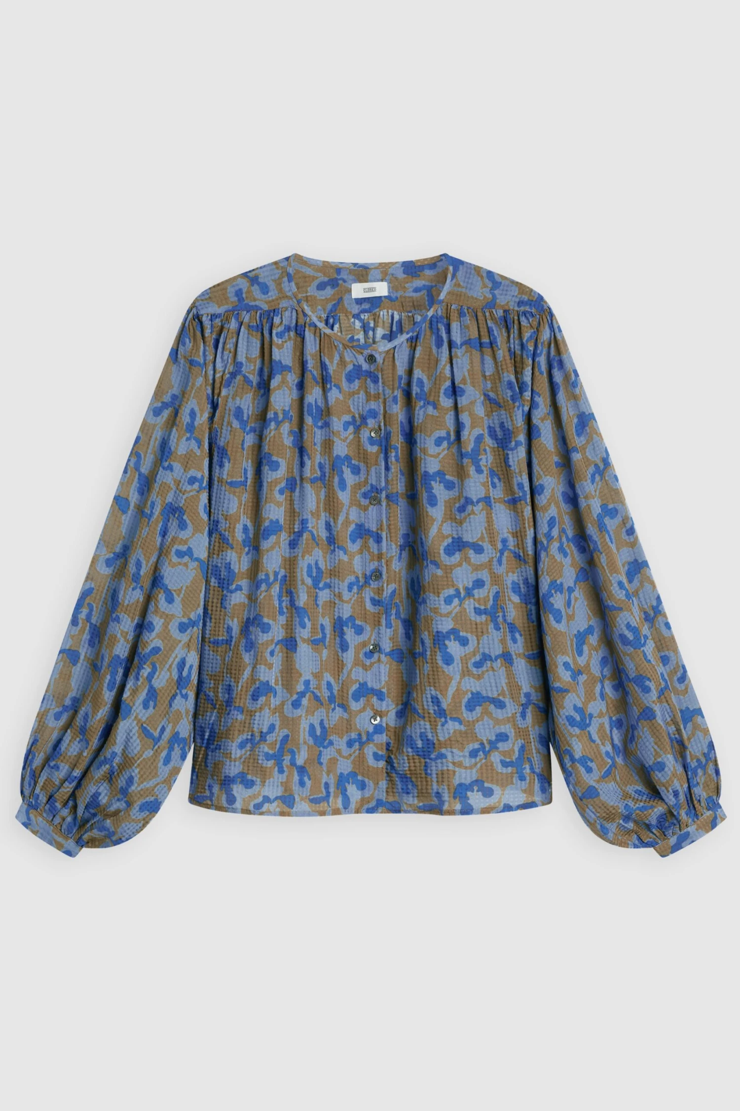 Im Relaxed Fit aus bedrucktem Baumwoll-Voile mit Waffelstruktur in leicht transparenter Optik: Stehkragenbluse mit Perlmuttknöpfen, schmalen Manschetten und Falten auf der Rückseite.
