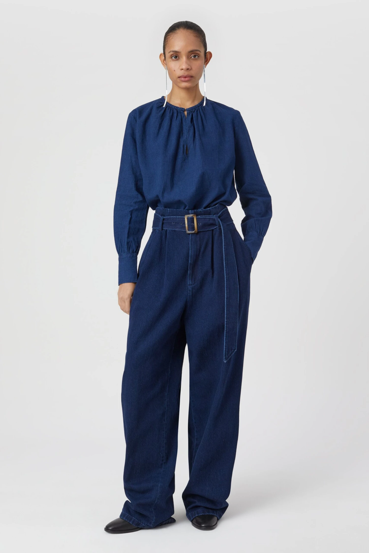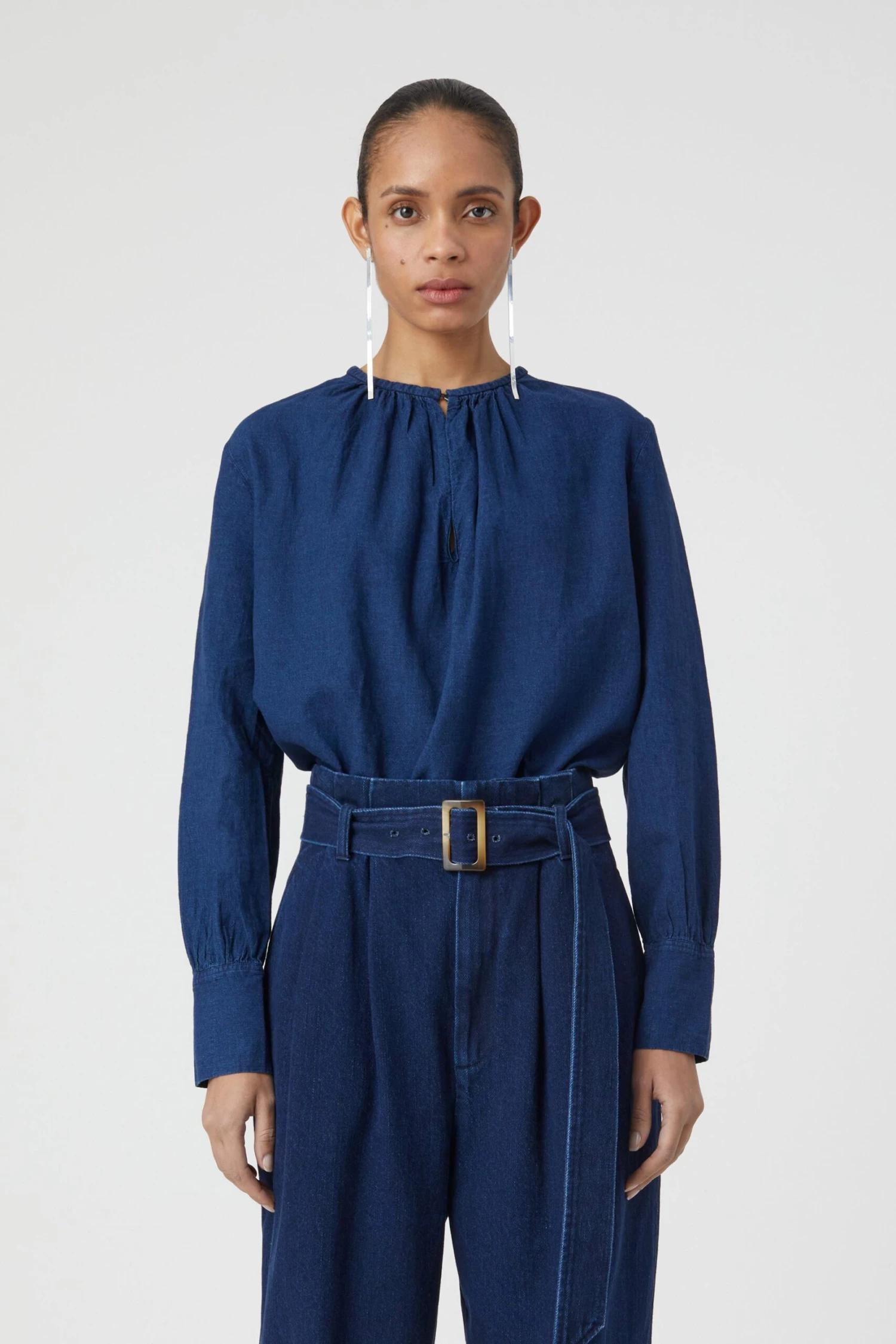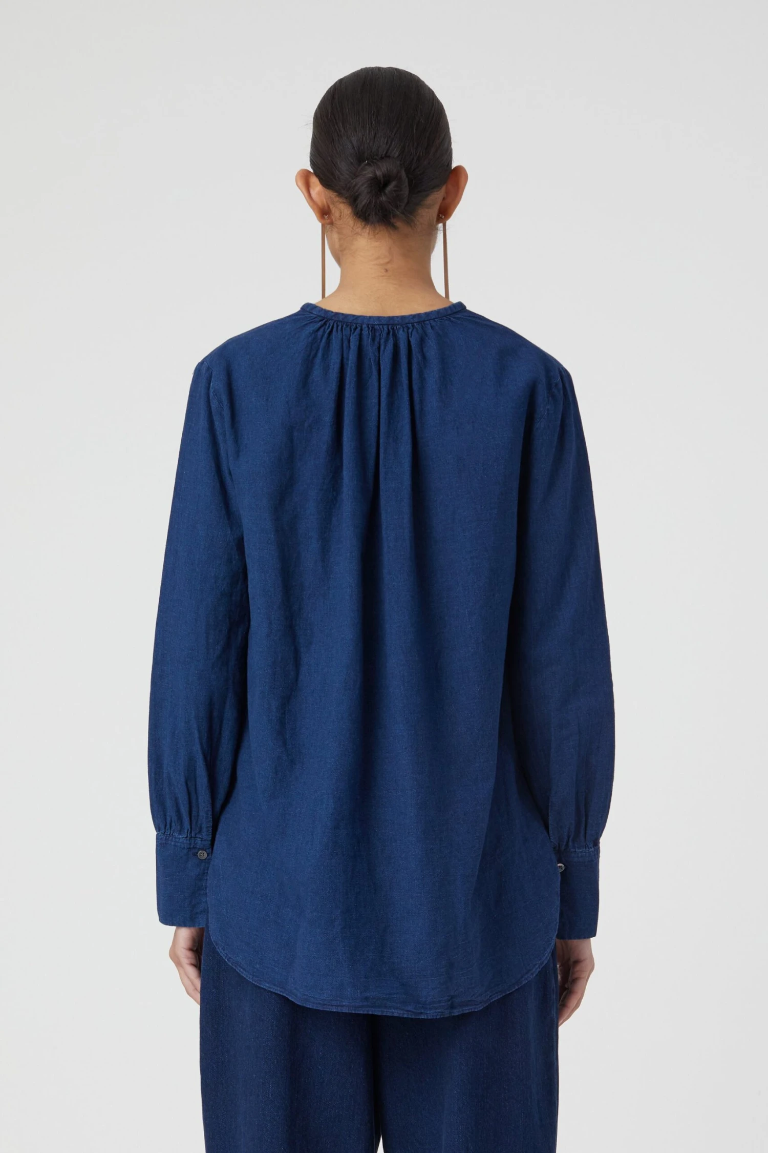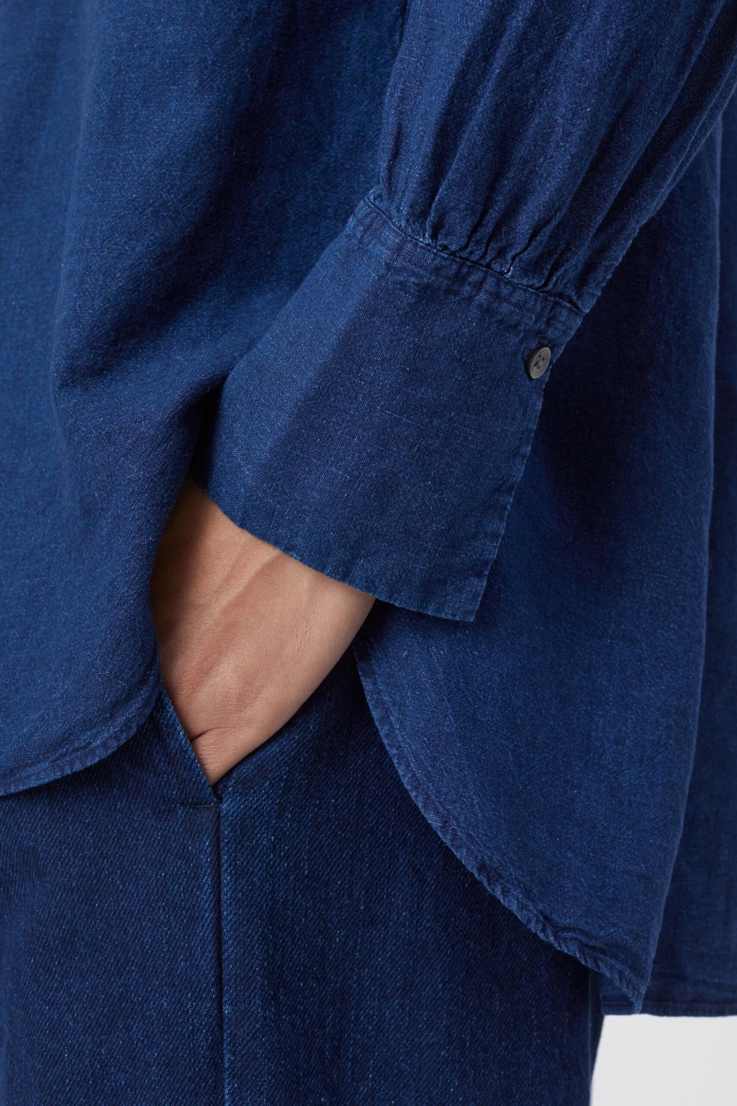 Aus leichtem Indigo-Leinen-Mix mit typisch lebendiger Struktur und weicher Haptik: In A-Linie geschnittene Bluse mit versteckter Knopfschließe und dezentem Schlitz, Falten am Ausschnitt, langen Ärmeln mit Manschetten und gerundetem Saum.