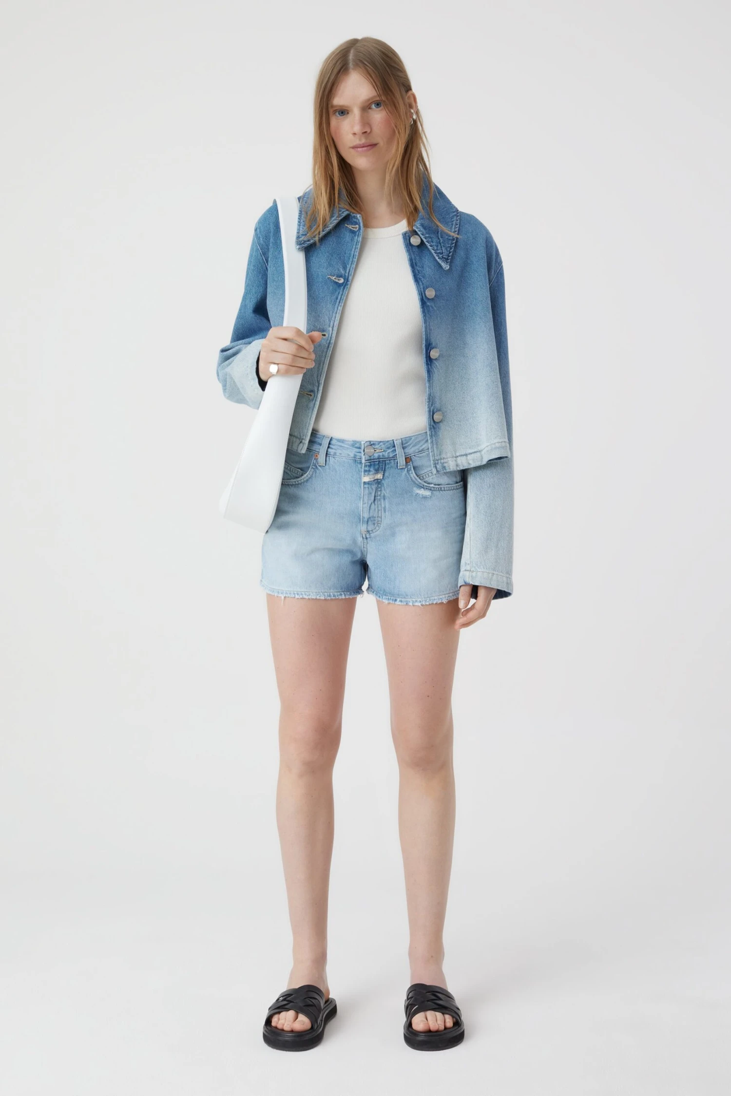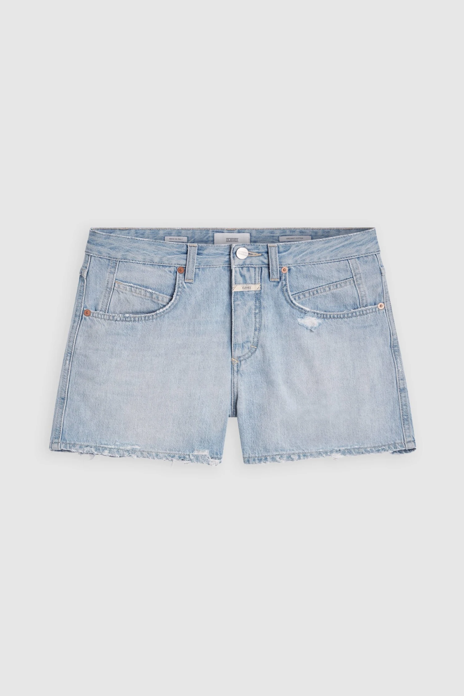 Teil unserer nachhaltigen Denim-Linie A BETTER BLUE: Hot Pants aus italienischem Non-Stretch-Denim von Candiani mit heller Waschung und Destroyed-Effekten. Im 5-Pocket-Style mit kupferfarbenen Nieten und veganem Patch aus Jacron.