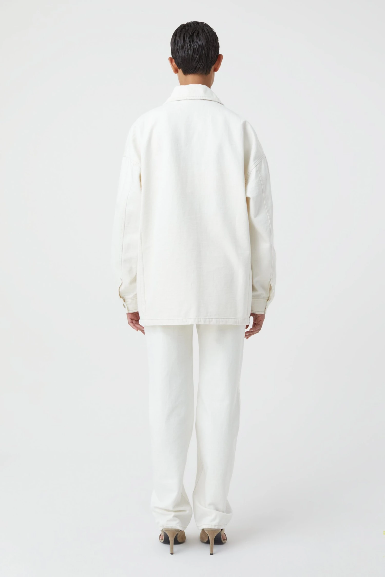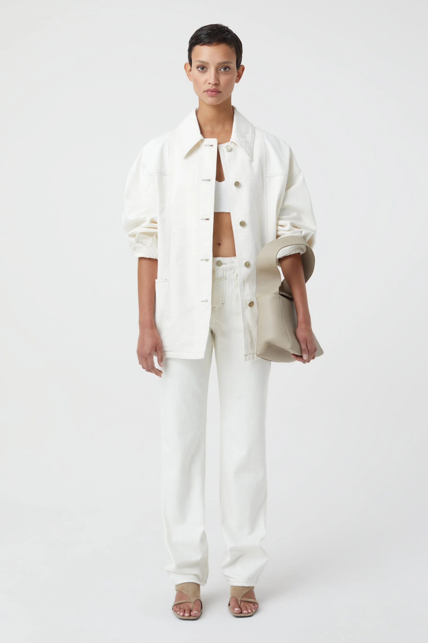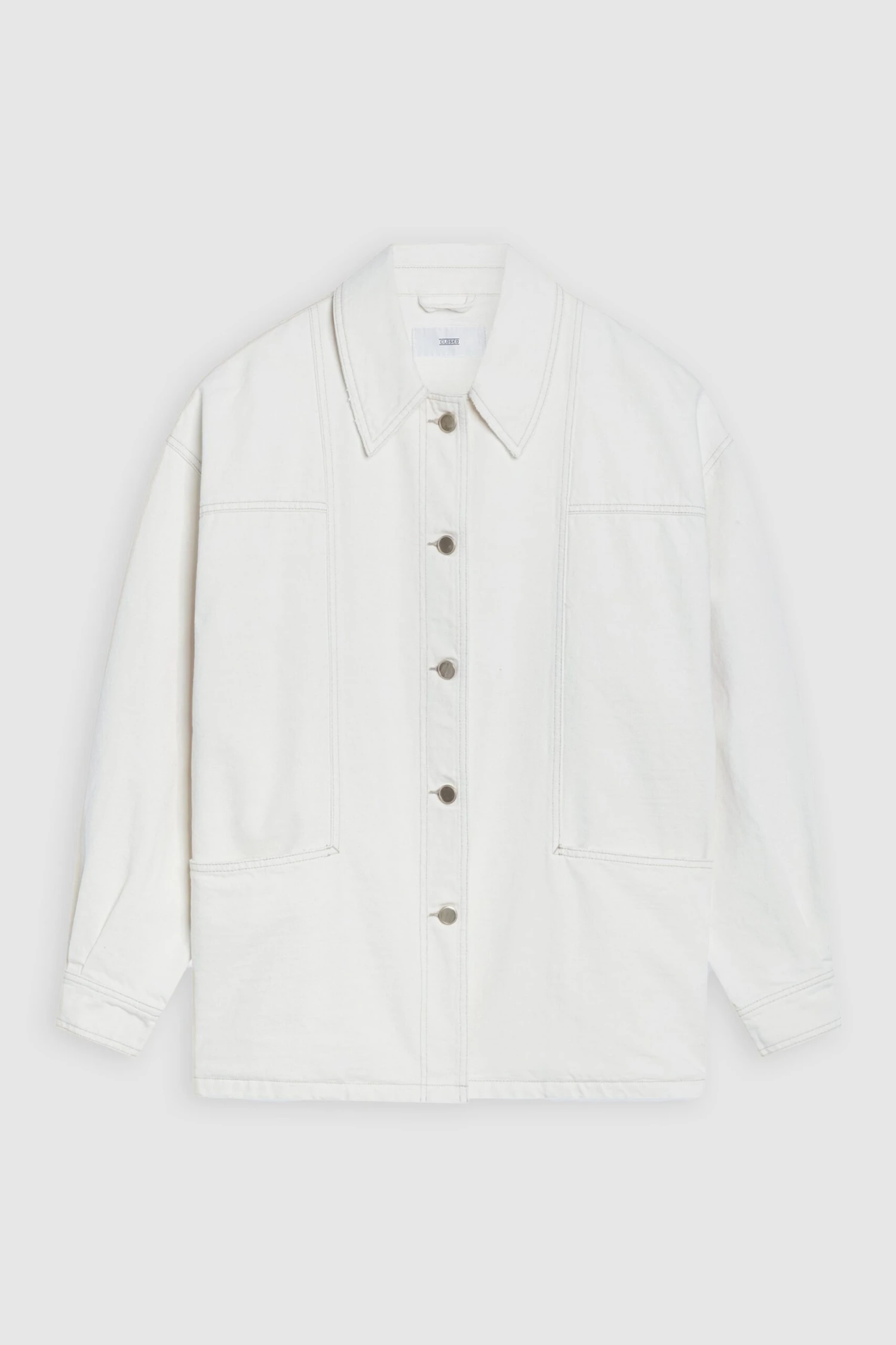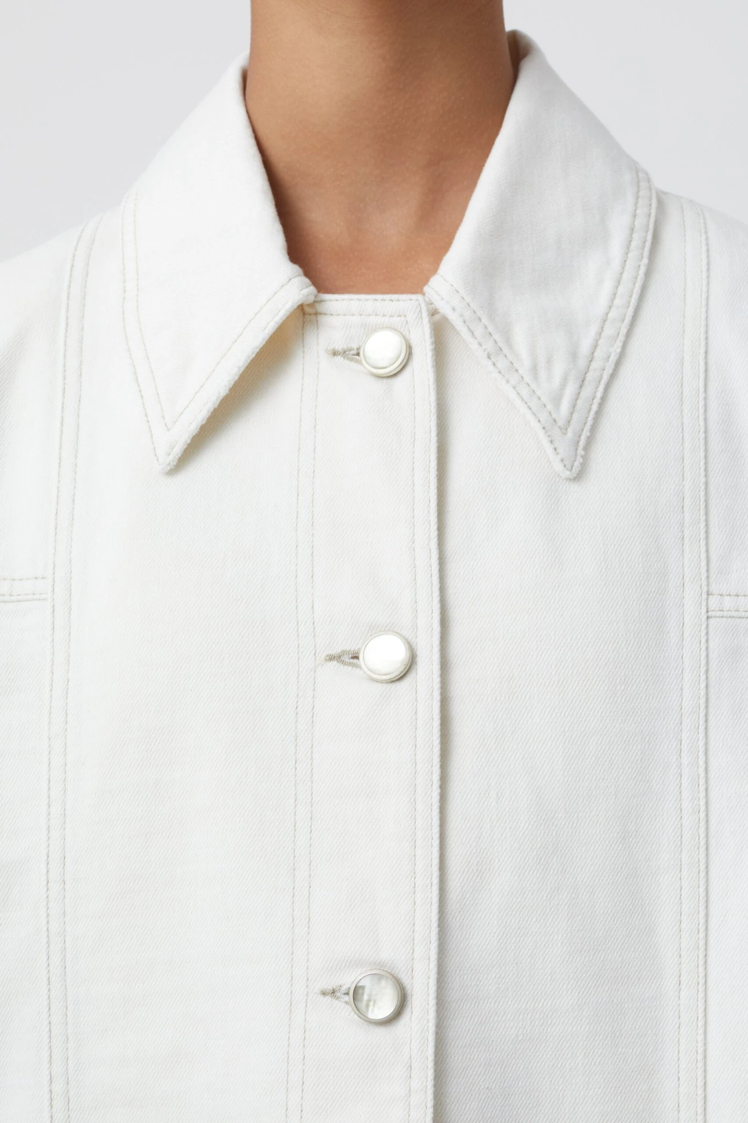 Aus kräftigem italienischem Denim in Ecru mit besonderer Struktur: Jacke im A-Shape mit dezenten Kontrastnähten, dekorativen Knöpfen in Perlmutt-Optik, großen Taschen und leichten Wasch-Effekten an den Kanten.