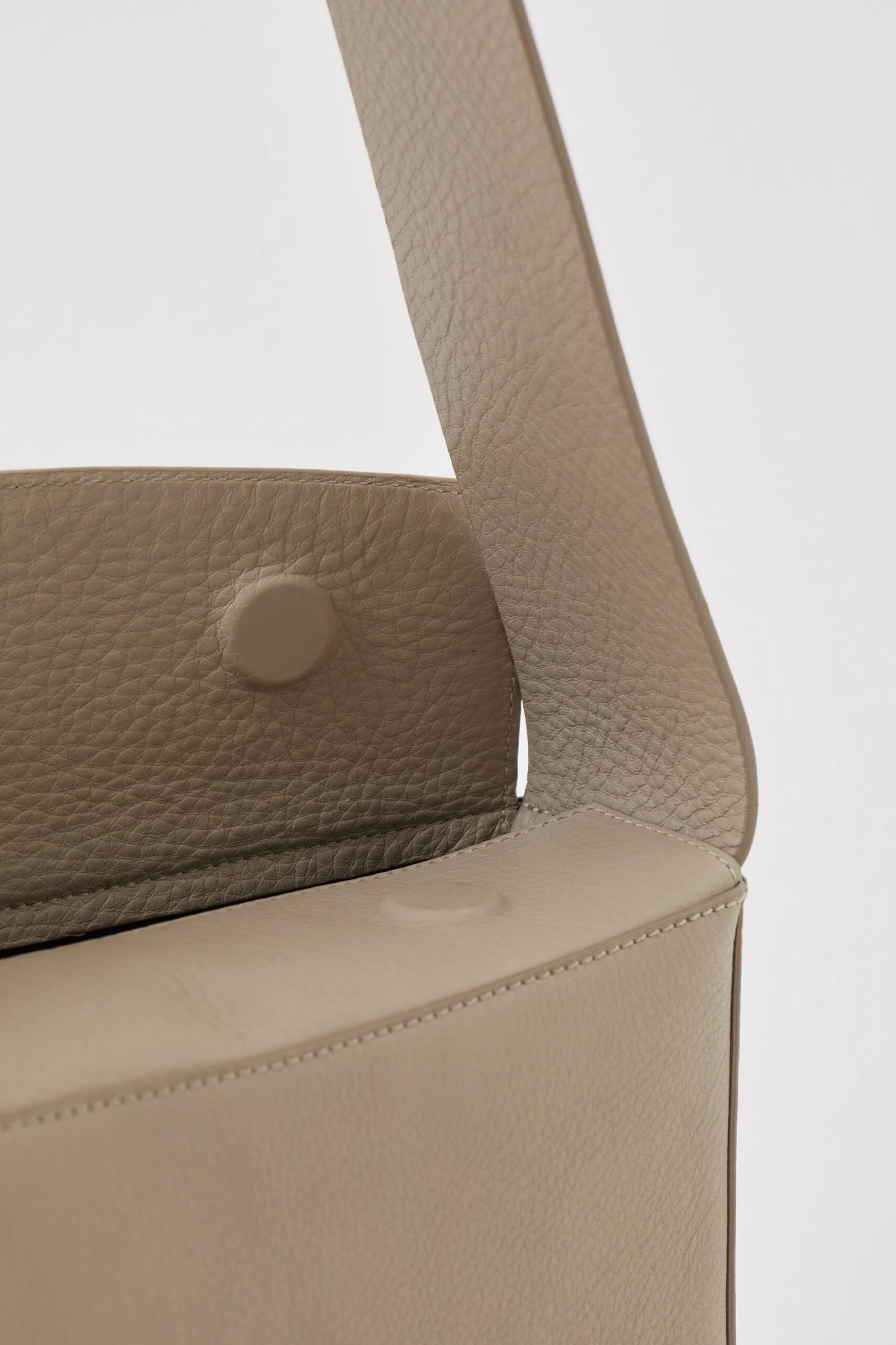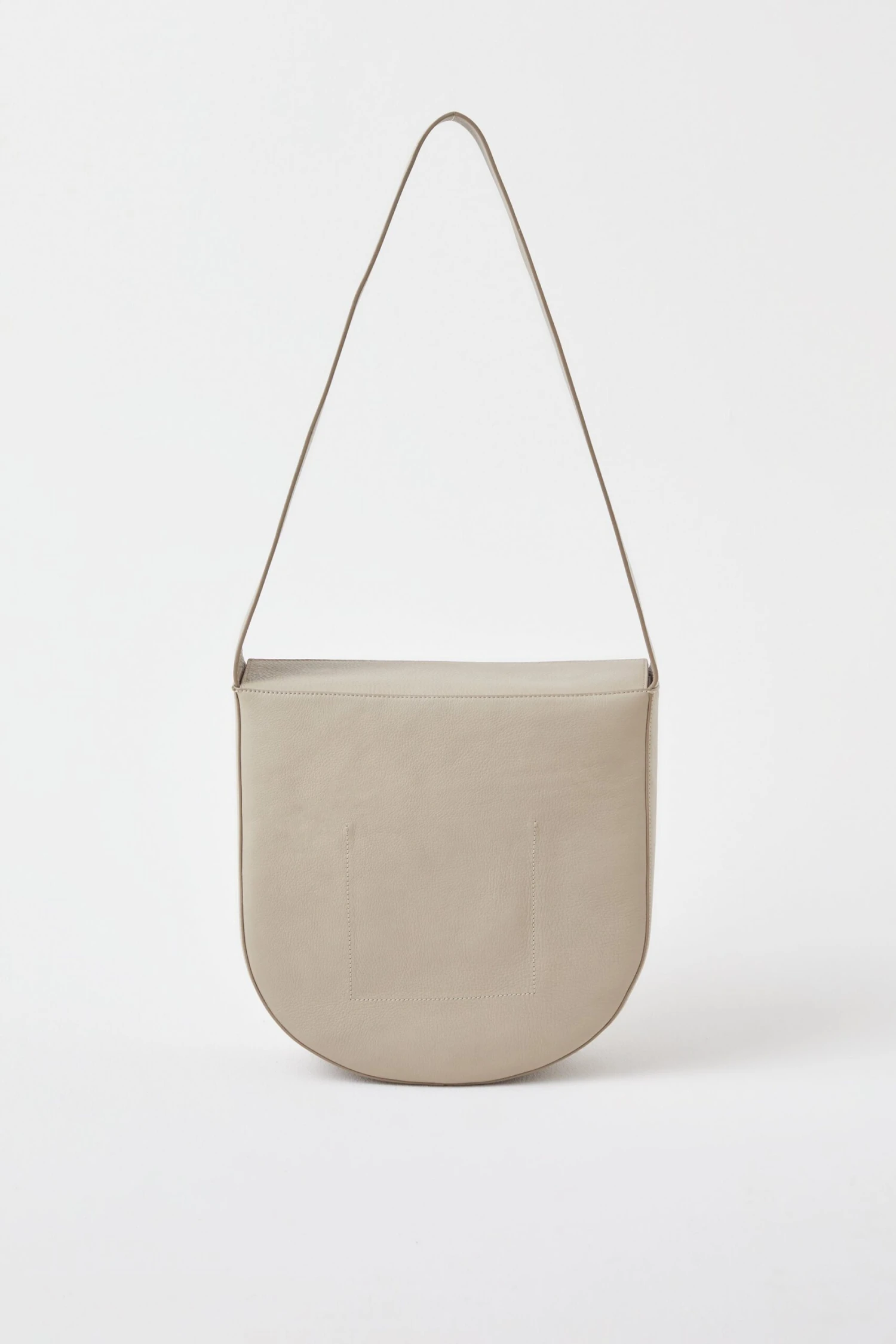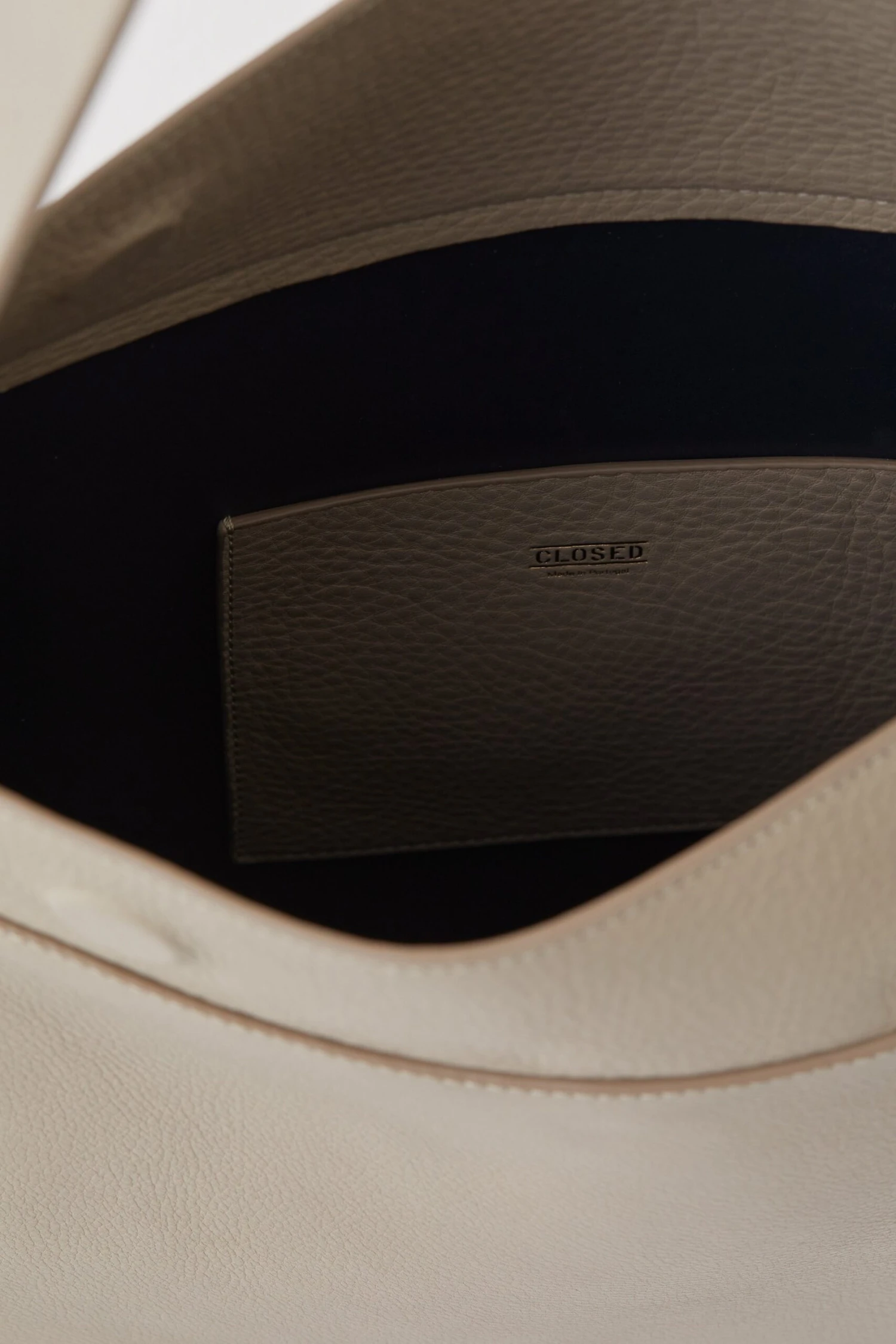 Aus deutlich strukturiertem Leder mit mehrfach handgefärbten und polierten Kanten gefertigt: Tasche mit breitem Riemen, Umschlag mit verdeckten Magnetschließen, Closed-Prägung in Metallic-Optik und Ledersteckfach innen.