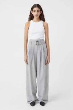 Gefertigt aus garngefärbter, gestreifter Qualität mit Schurwolle und Elasthan in Melange-Optik: Style Imogen im Wide Fit mit Taillengürtel, Schließe in Horn-Optik, Bundfalten, seitlichen Eingrifftaschen und Leistentaschen auf der Rückseite.