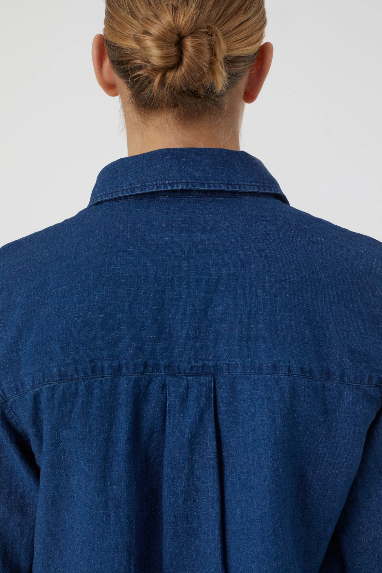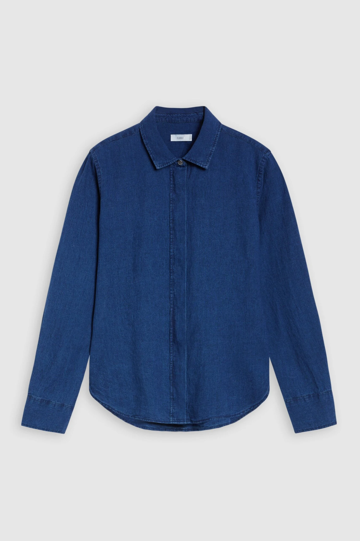 Gefertigt aus leichtem Indigo-gefärbtem Leinen-Baumwolle-Mix mit lebendiger Struktur in gewaschener Optik: Hemdbluse im Regular Fit mit verdeckter Knopfleiste und Perlmuttknöpfen.