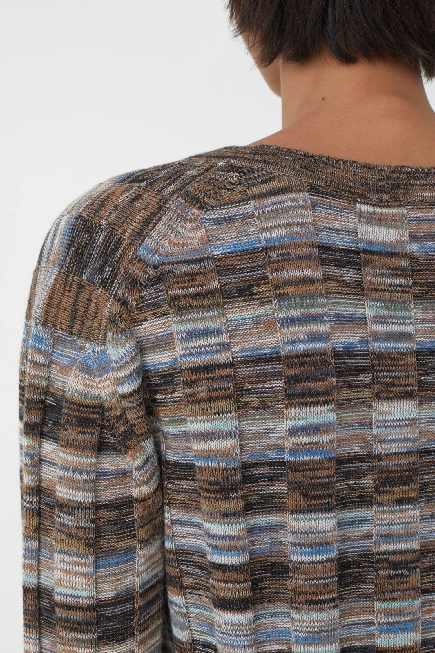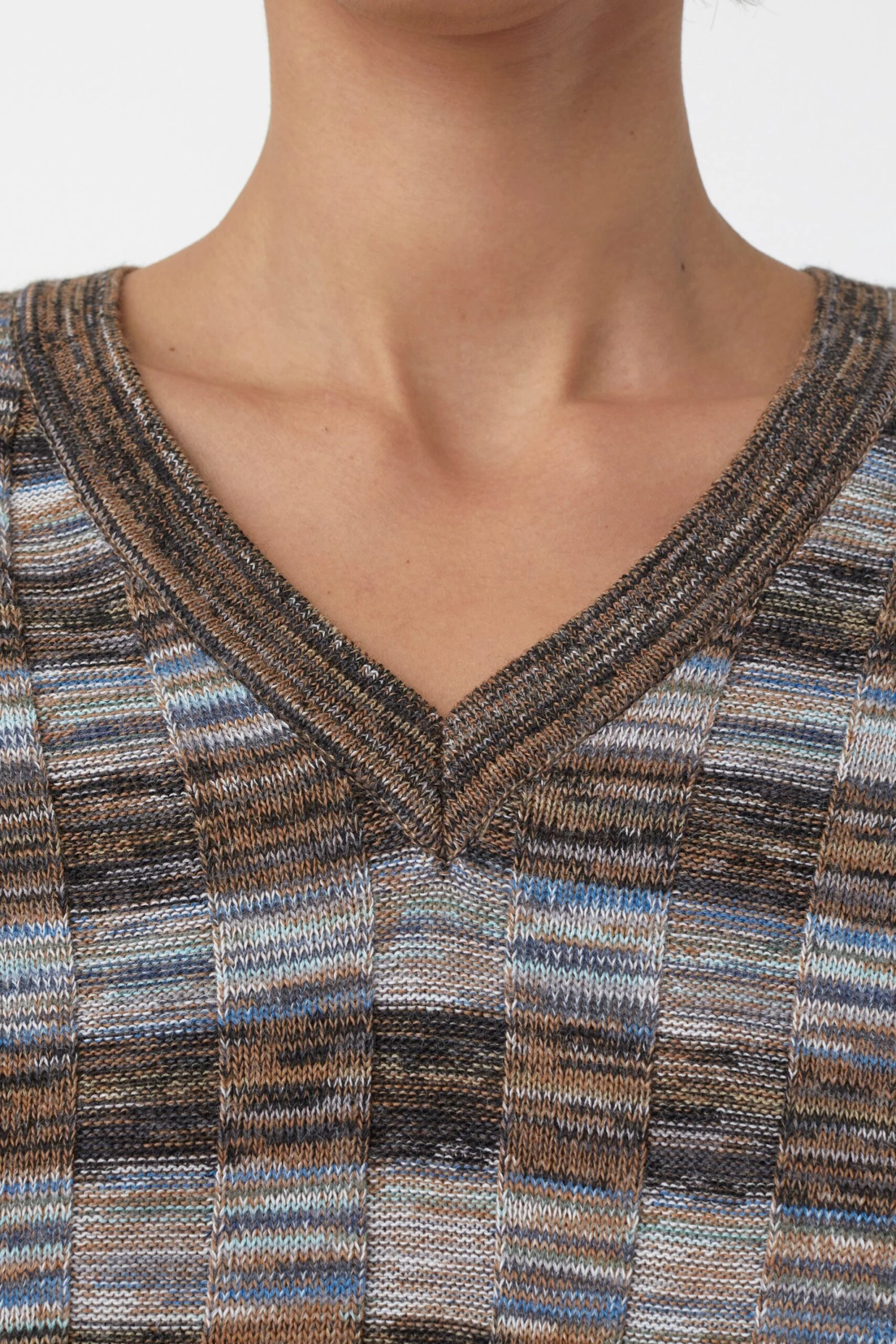Die breit gerippte Struktur verleiht dem V-Pullover Elastizität. Gefertigt aus italienischem Garn mit mehrfarbigem Mouliné-Effekt. Hierbei werden beim Stricken der Artikel drei unterschiedlich farbige Garne eingesetzt, sodass zufällige Effekte und Muster entstehen. So wird jedes Teil zum Unikat.