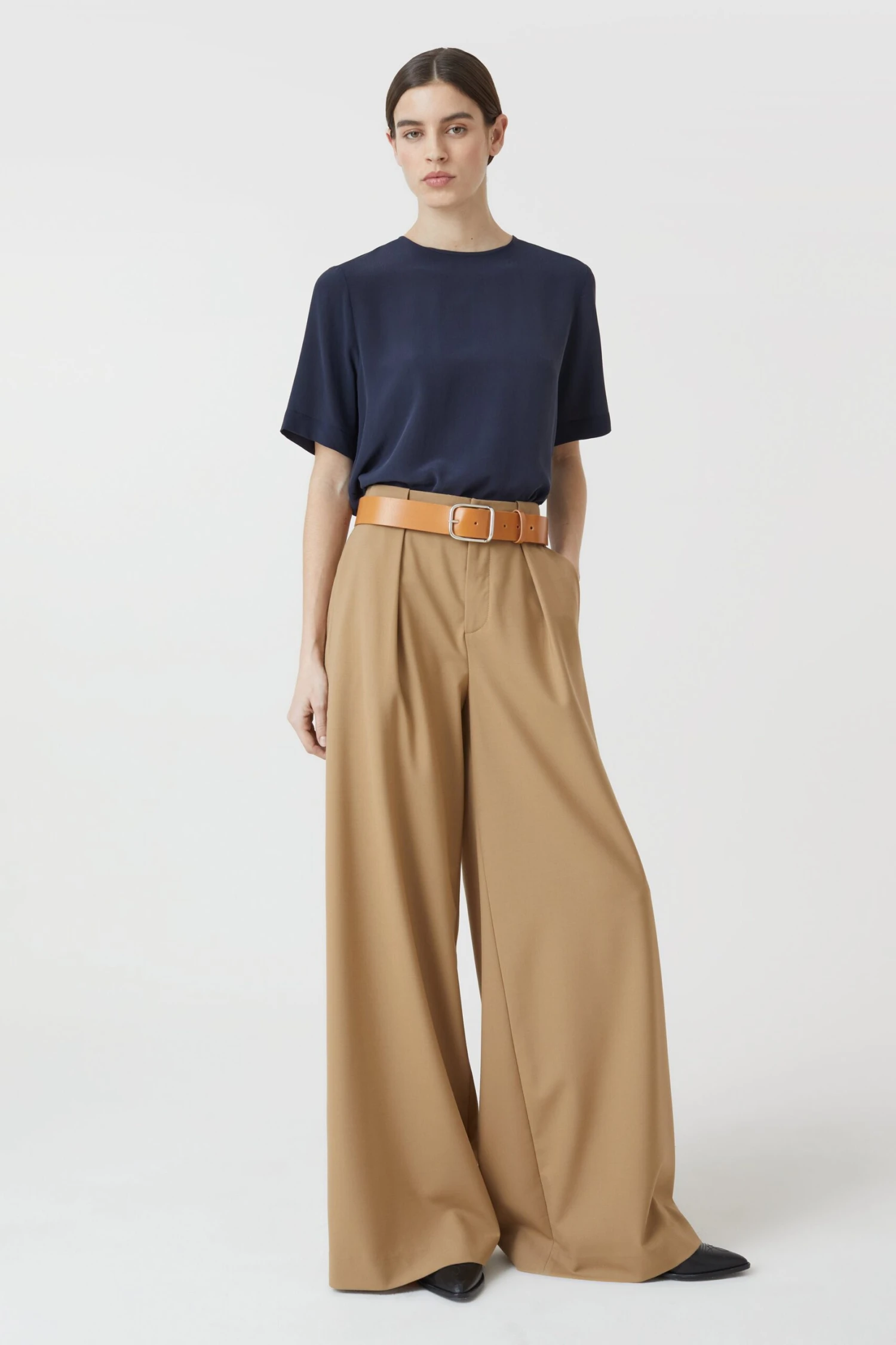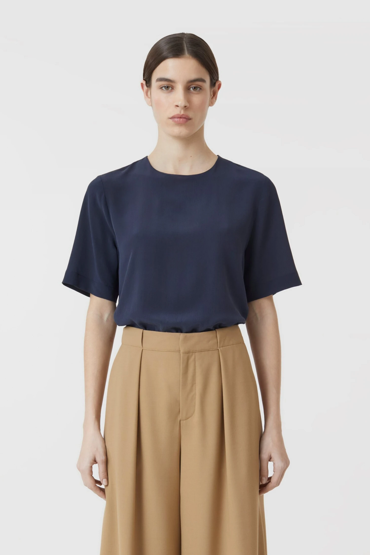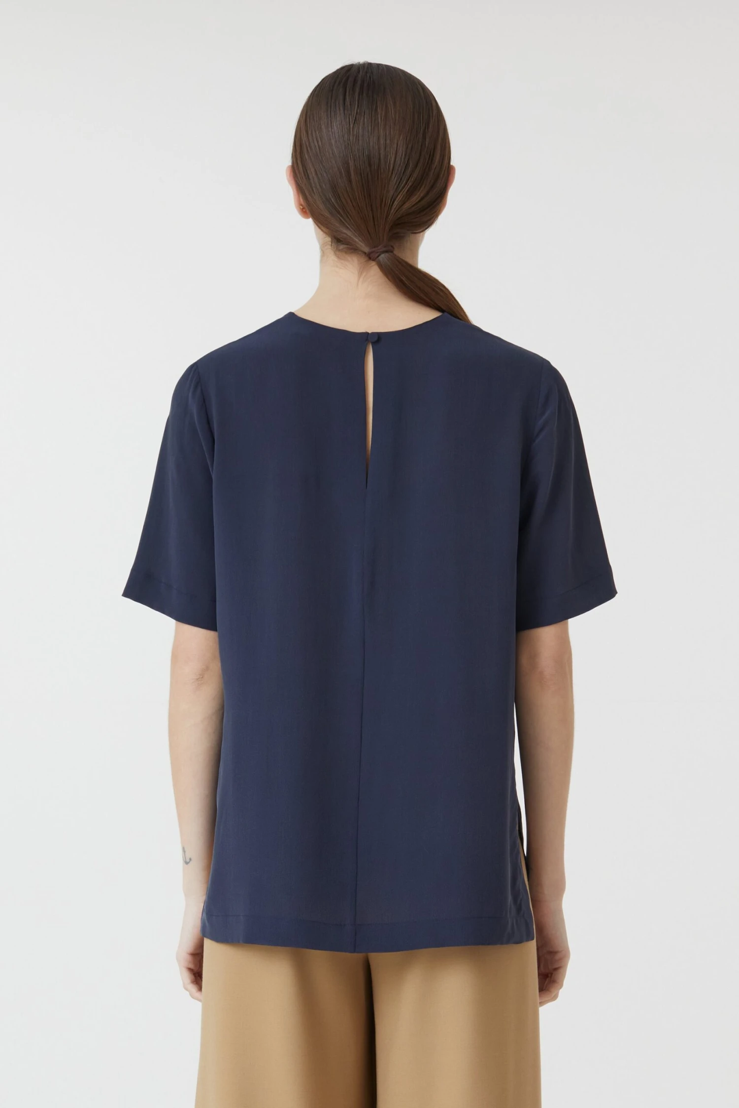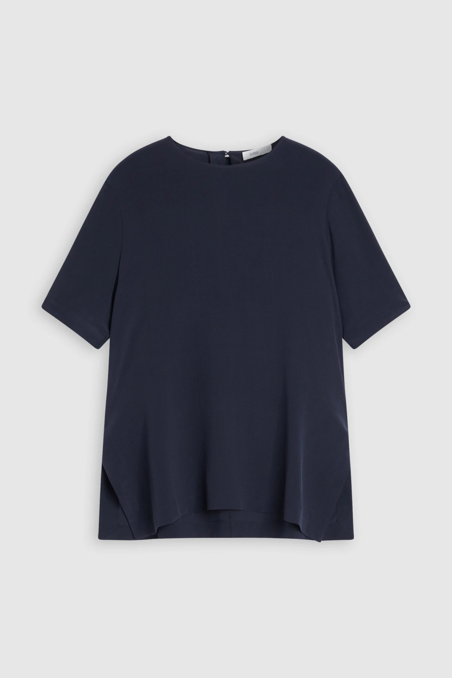 Aus weich fallendem Crêpe de Chine im cleanen Look: Bluse mit Rundhalsausschnitt und Seitenschlitzen.