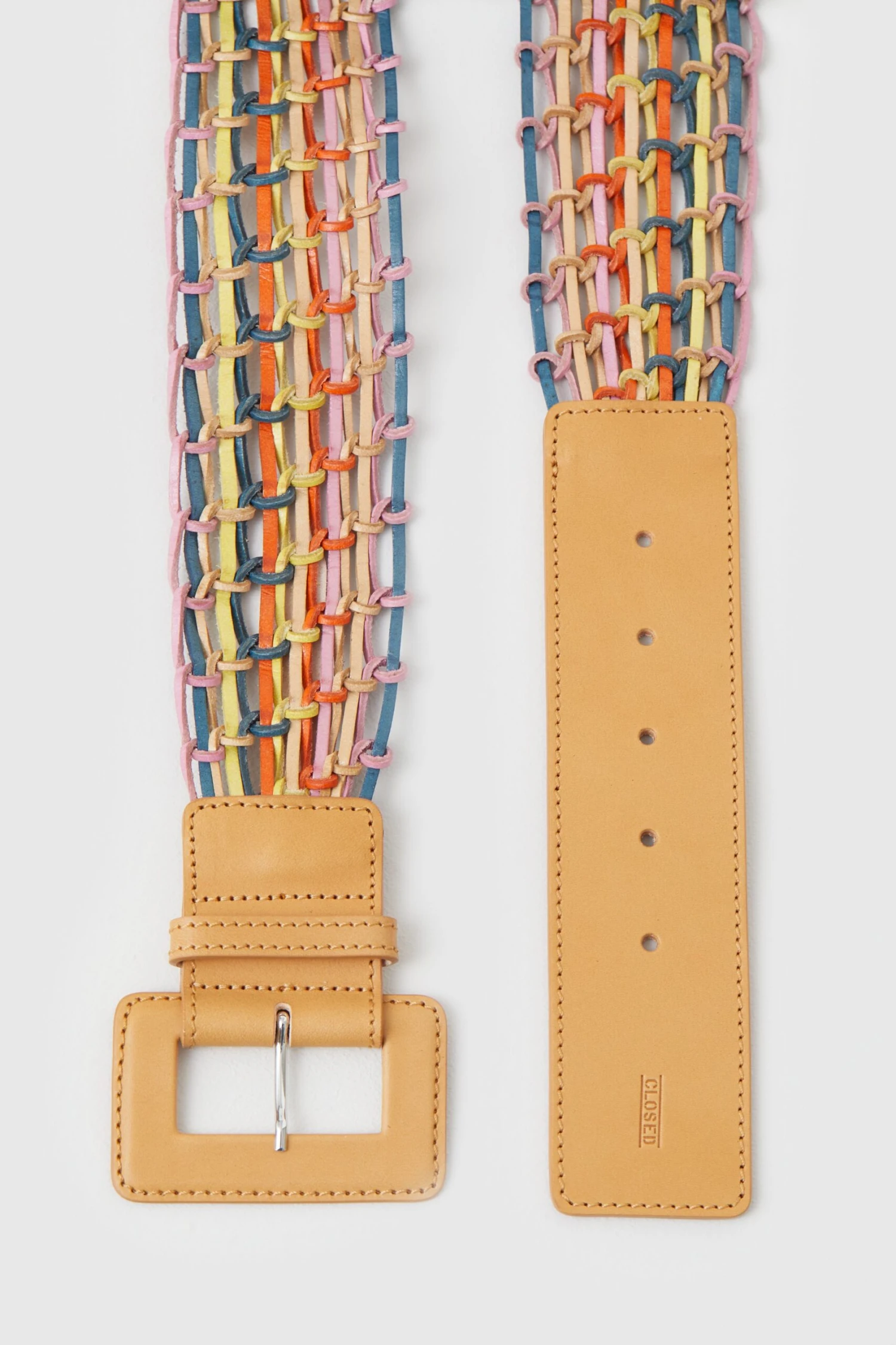 Geflochtener Taillengürtel aus schmalen eingefärbten Lederbändern mit unifarbenen Enden, Logo-Prägung und Leder-überzogener Dornschließe.