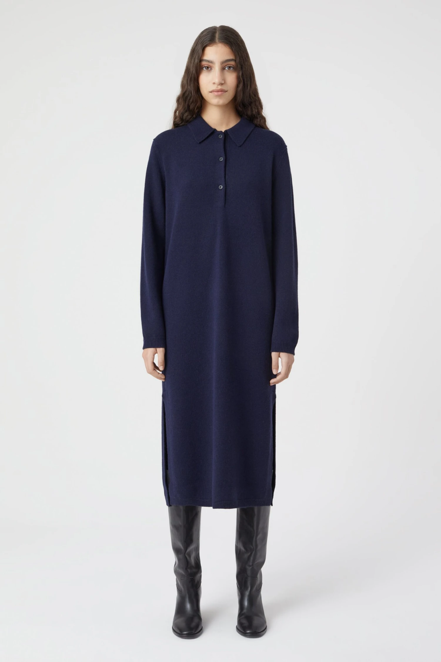 Aus weichem Merino-Cashmere-Mix im mittelschweren Strick: Lang geschnittenes Polokleid mit Knopfleiste, tonigen Knöpfen, langen Ärmeln und hohen Seitenschlitzen.