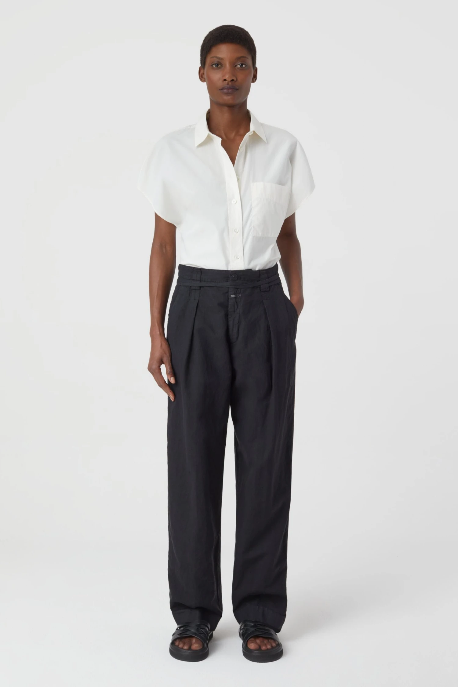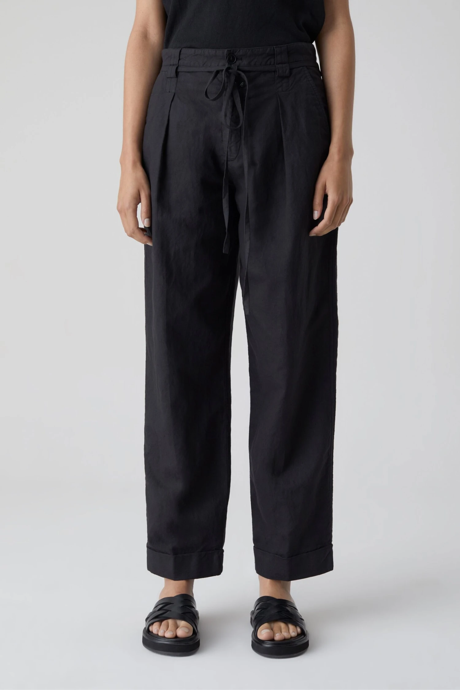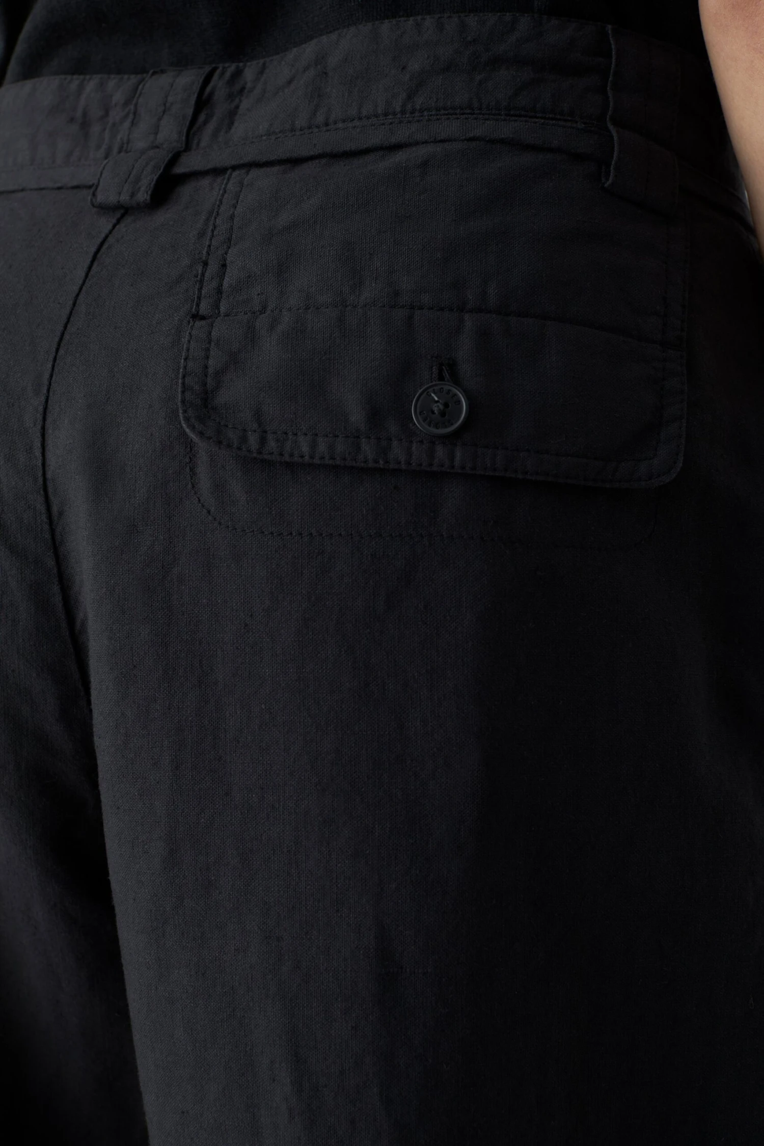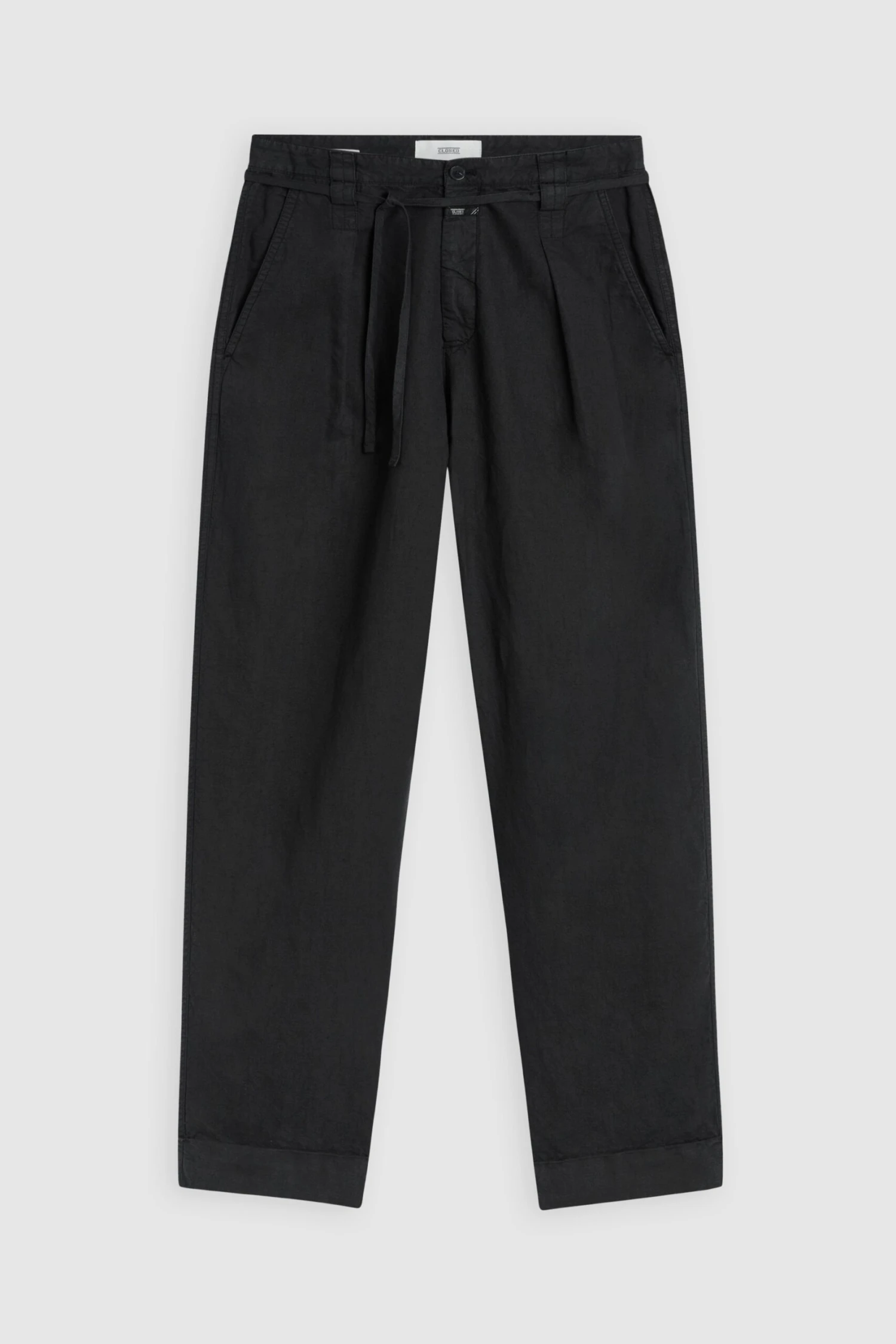 New Relaxed Fit mit mittlerer Bundhöhe und schmal zulaufender Beinform. Aus Leinen-Baumwolle-Mix mit lebendiger Struktur, trockener Haptik und Garment-dye-Finish – zugeschnitten und konfektioniert bei Texdata in Rumänien.