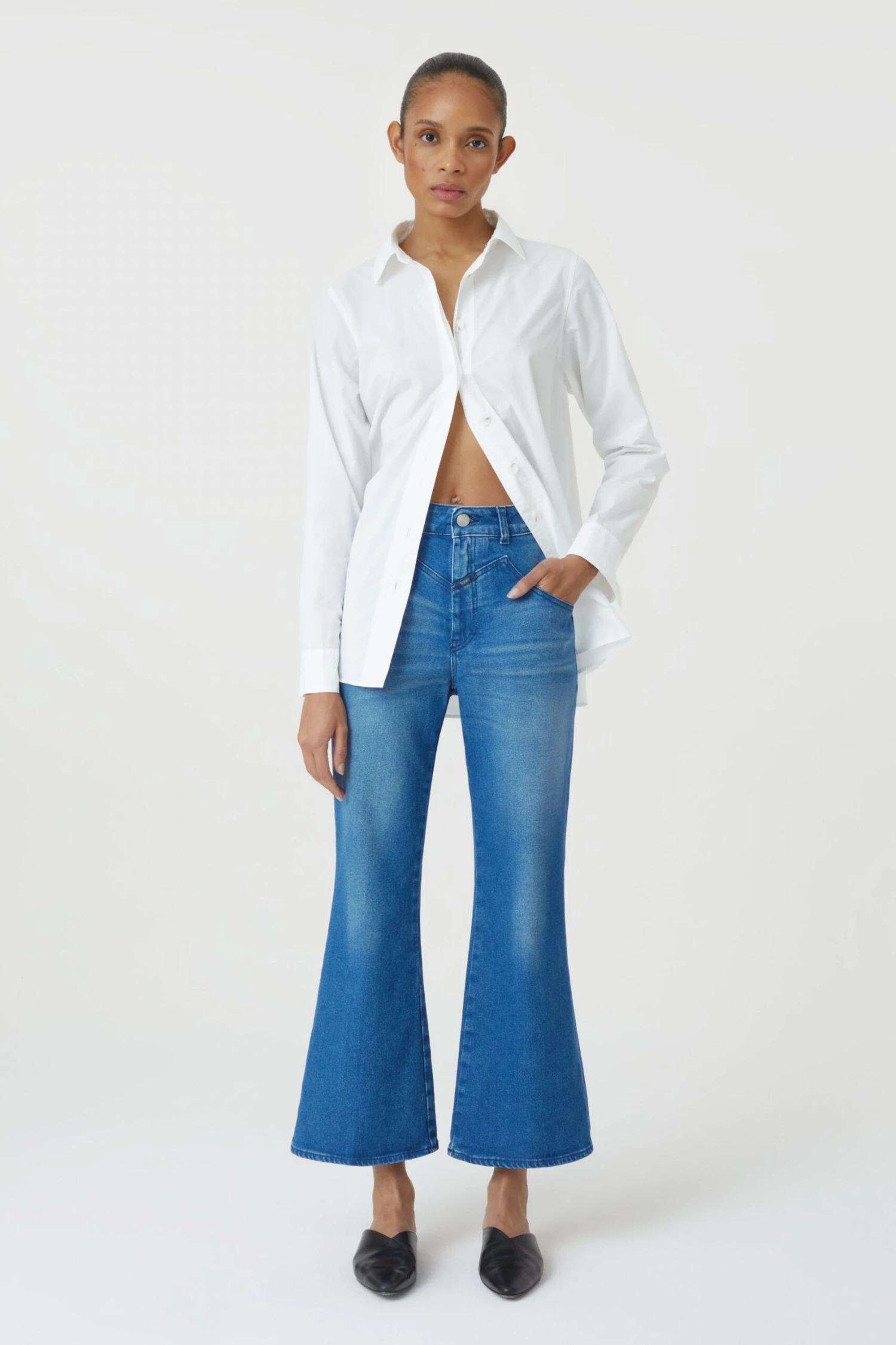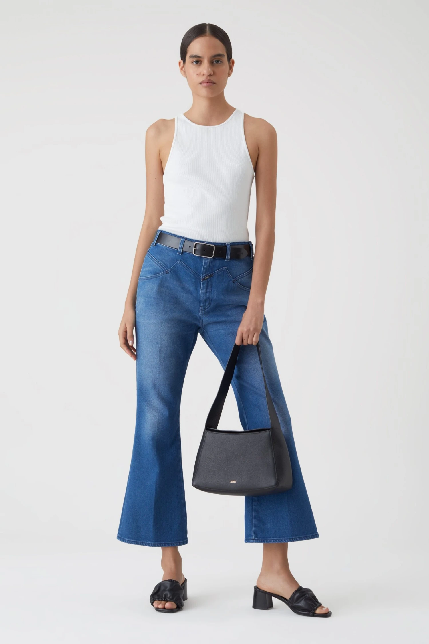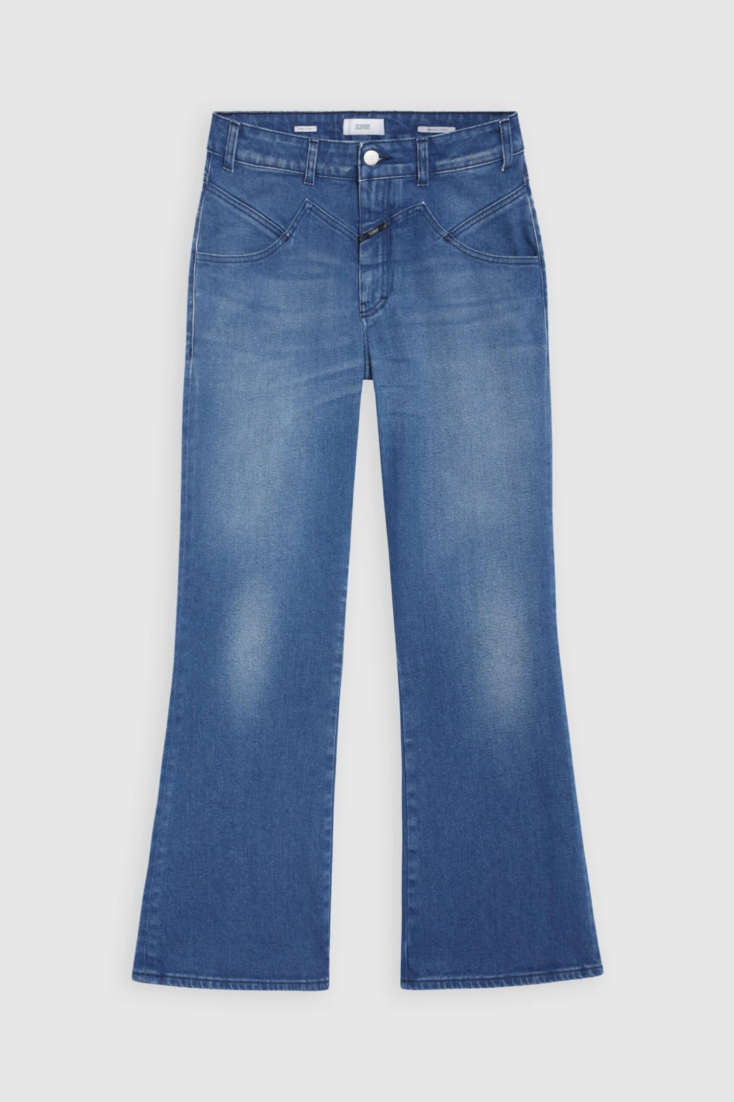 New Flared Fit im Western-Style aus Denim mit gleichmäßiger Struktur – 70er-Jahre inspirierter Comfort Stretch Denim mit Bio-Baumwolle, recycelter Baumwolle und recyceltem Elasthan. Teil unserer nachhaltigen Denim-Linie A BETTER BLUE.