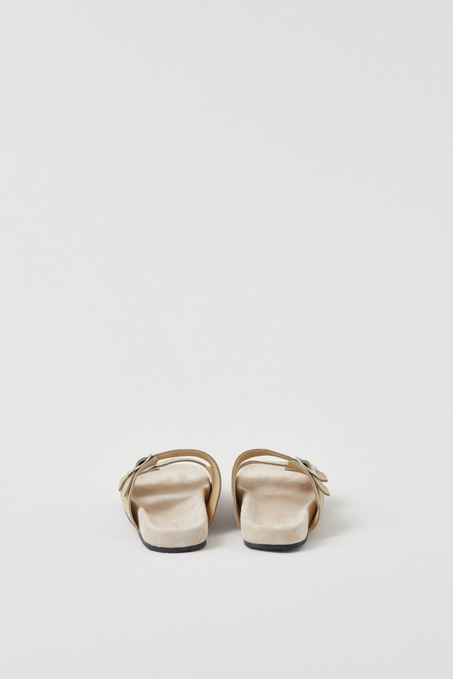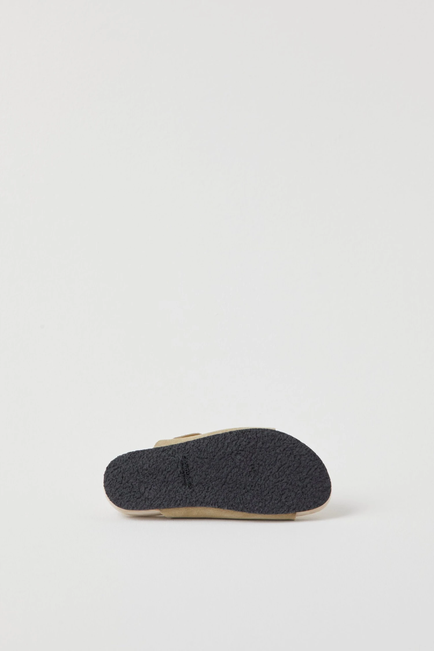 Sandale aus feinem italienischem Veloursleder mit weitenverstellbaren Riemen, überzogener Innensohle und leichtem Fußbett. Zu 100 Prozent made in Italy.