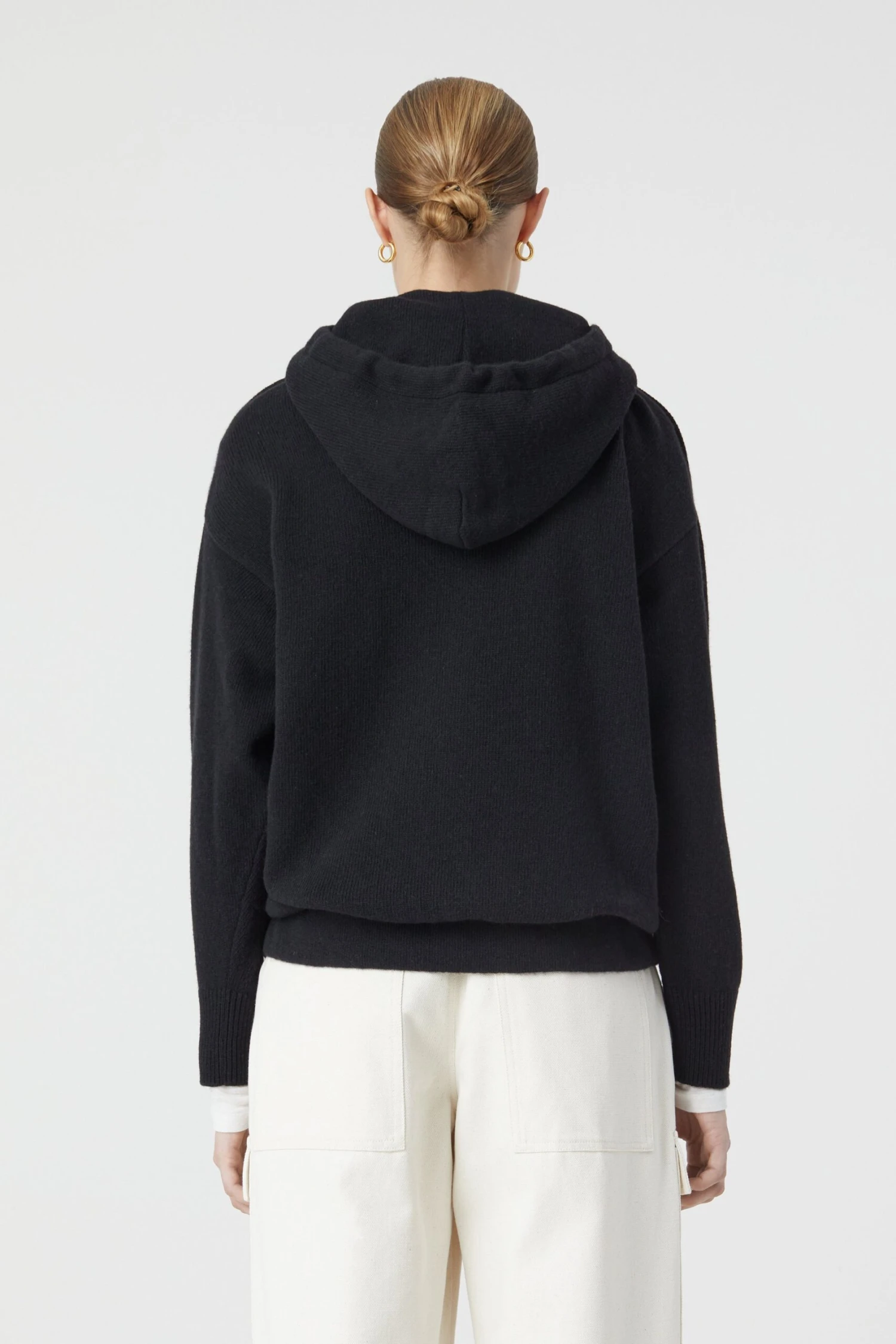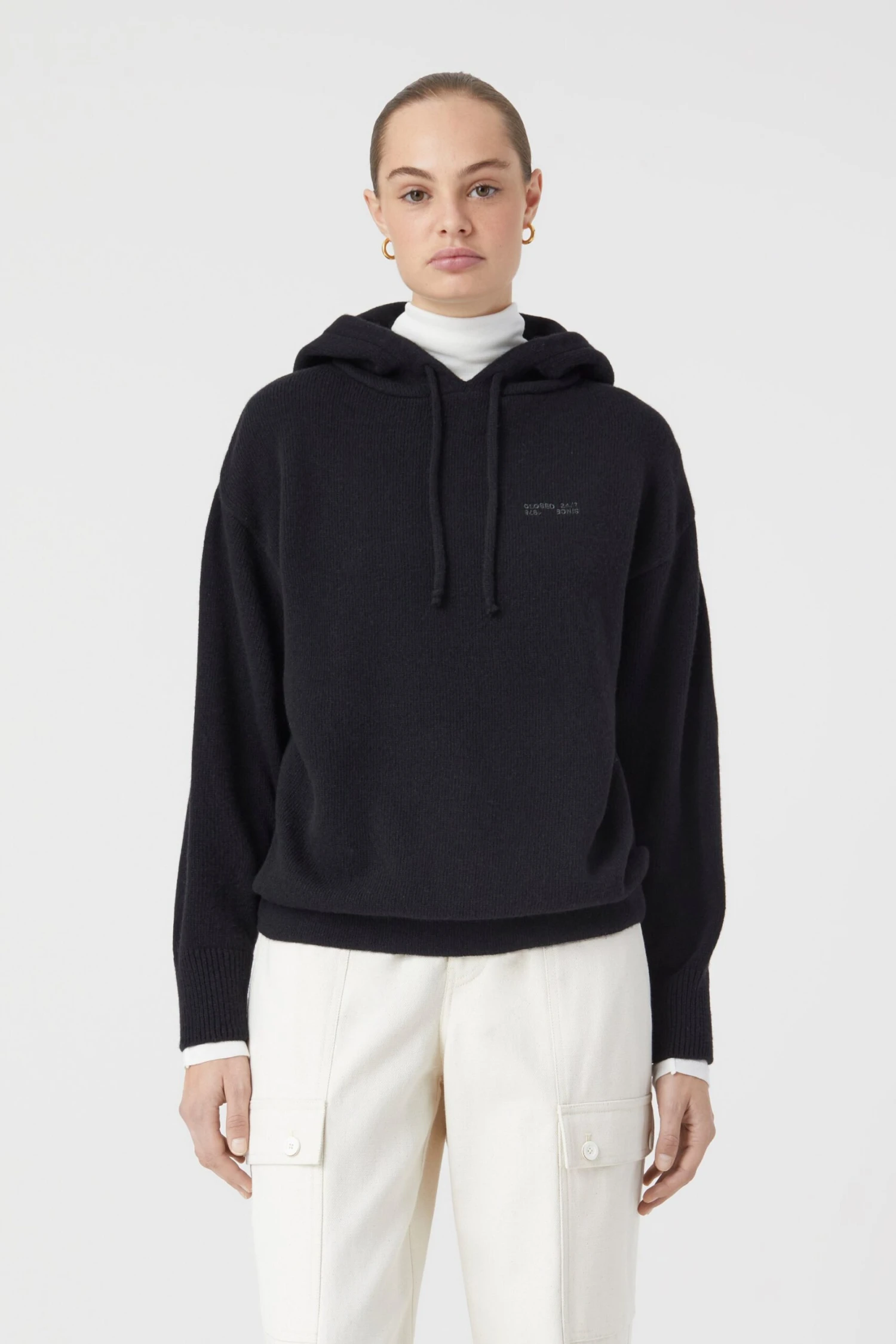 Aus weicher Lammwolle im mittelschweren Strick: Hoodie mit doppelt gestrickter Kapuze und Tunnelzug, Closed 24/7- Stickerei, leicht überschnittener Schulter sowie Rippbündchen an Ärmel- und Saumabschluss.