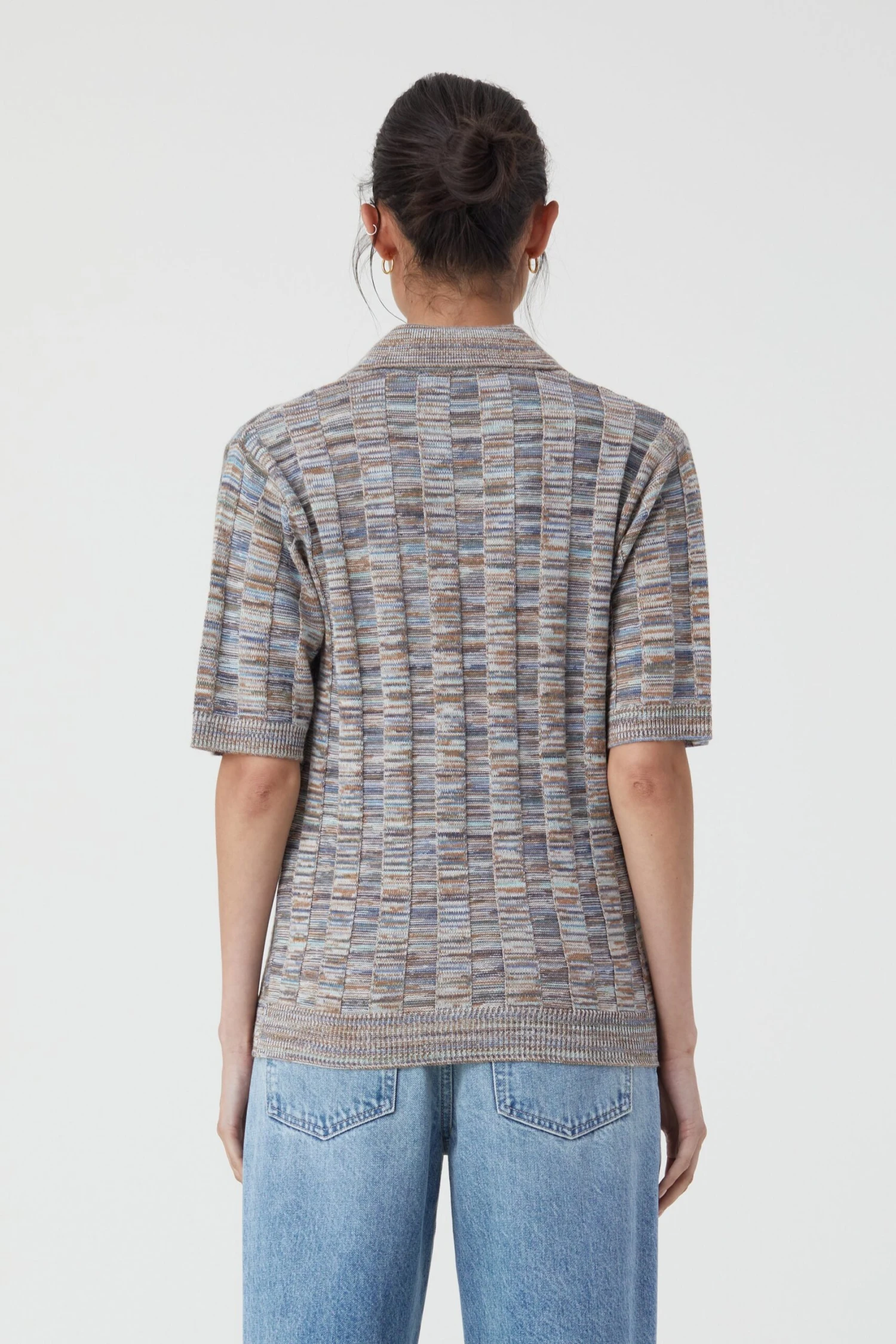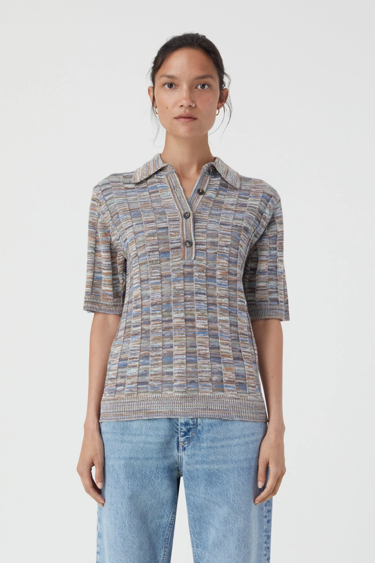 Aus italienischem Garn mit mehrfarbigem Mouliné-Effekt. Hierbei werden beim Stricken der Artikel drei unterschiedlich farbige Garne eingesetzt, sodass zufällige Effekte und Muster entstehen. Diese Vorgehensweise macht jedes Teil zum Unikat. Die breit gerippte Struktur verleiht dem Poloshirt Elastizität.