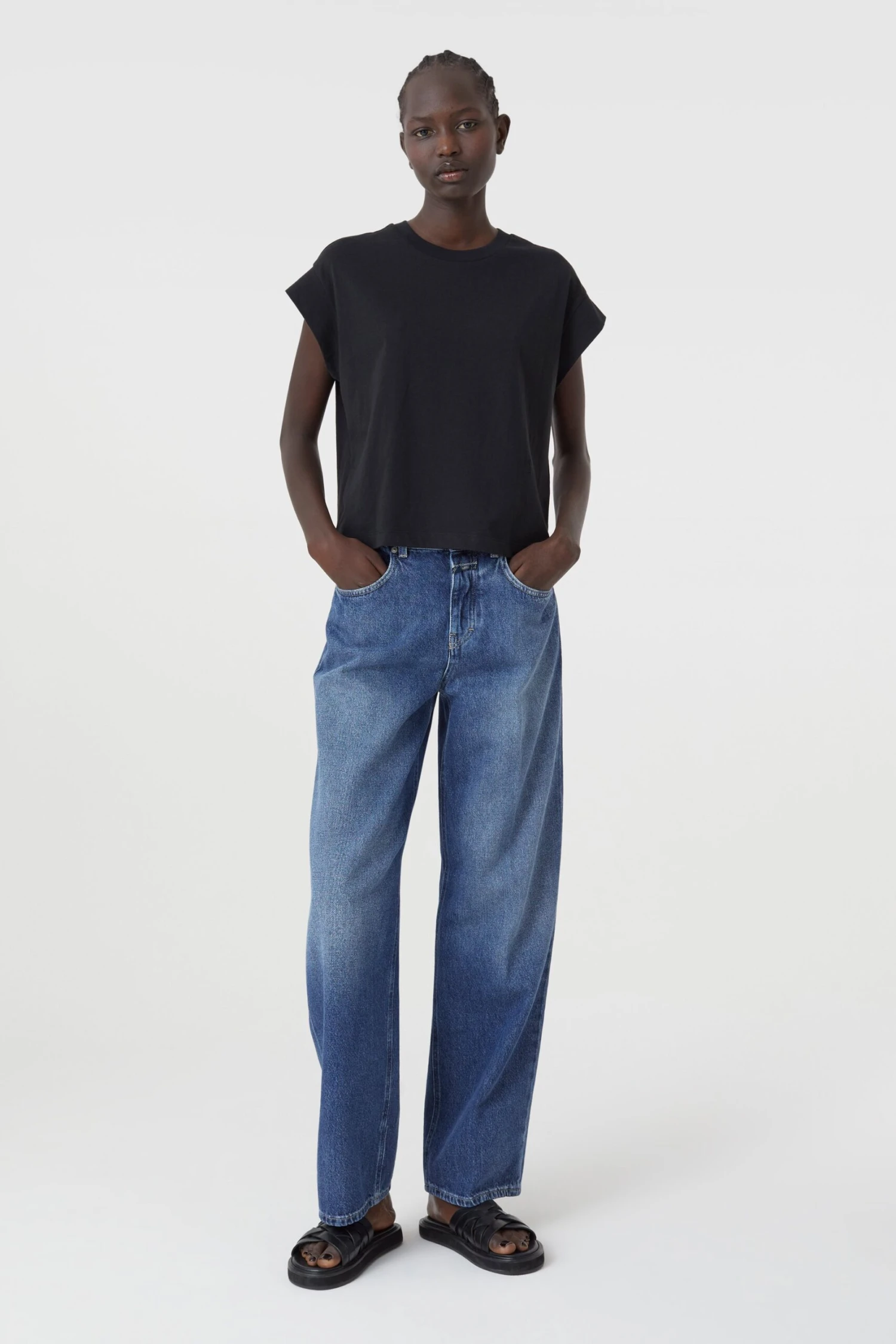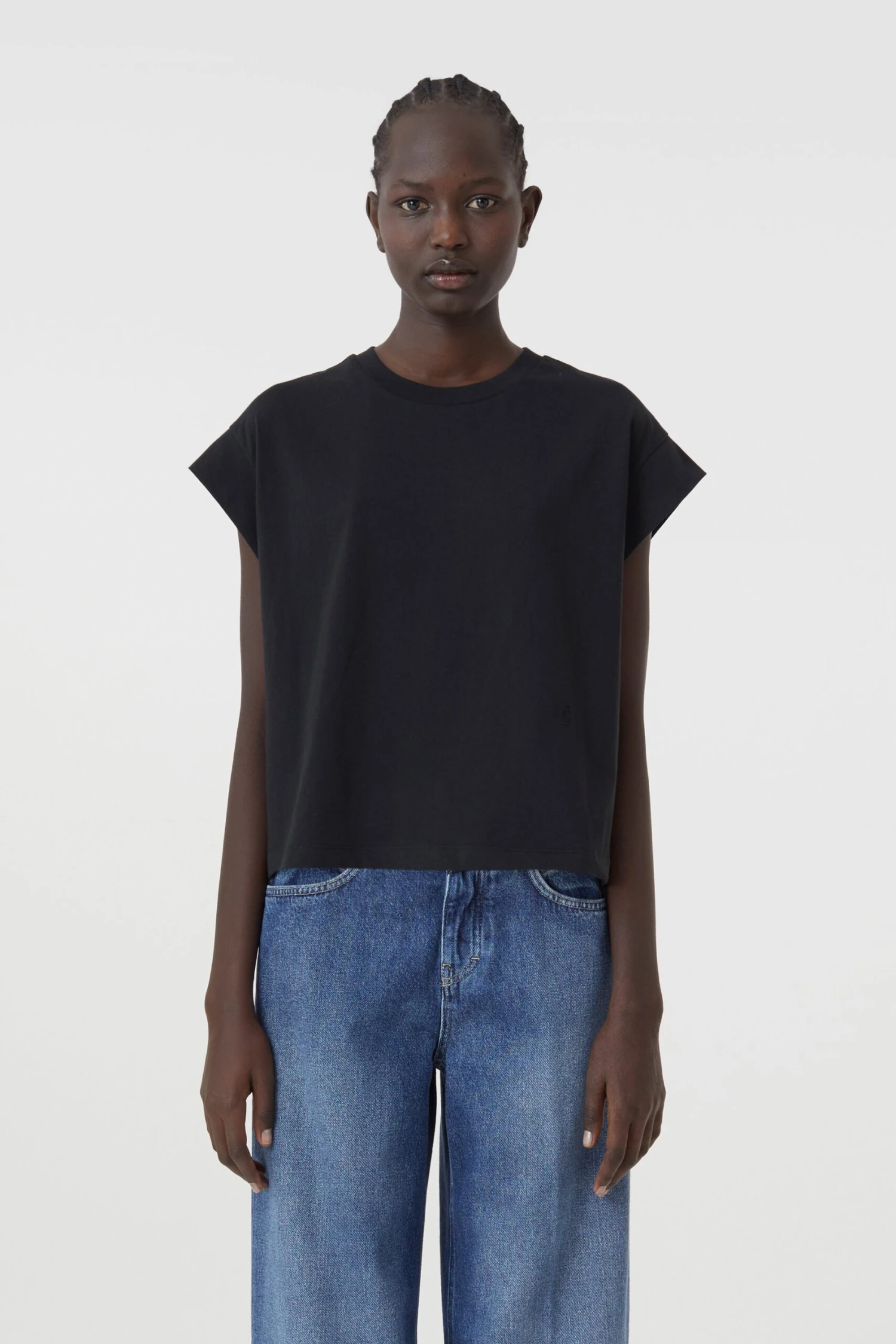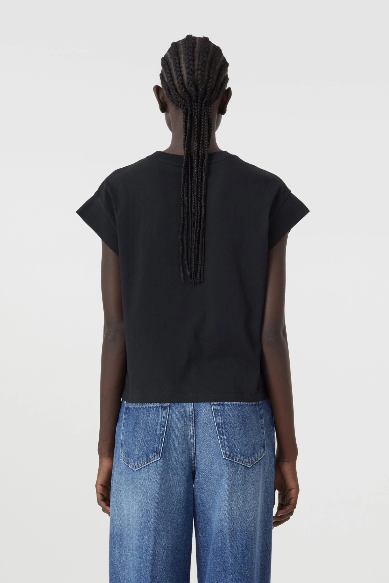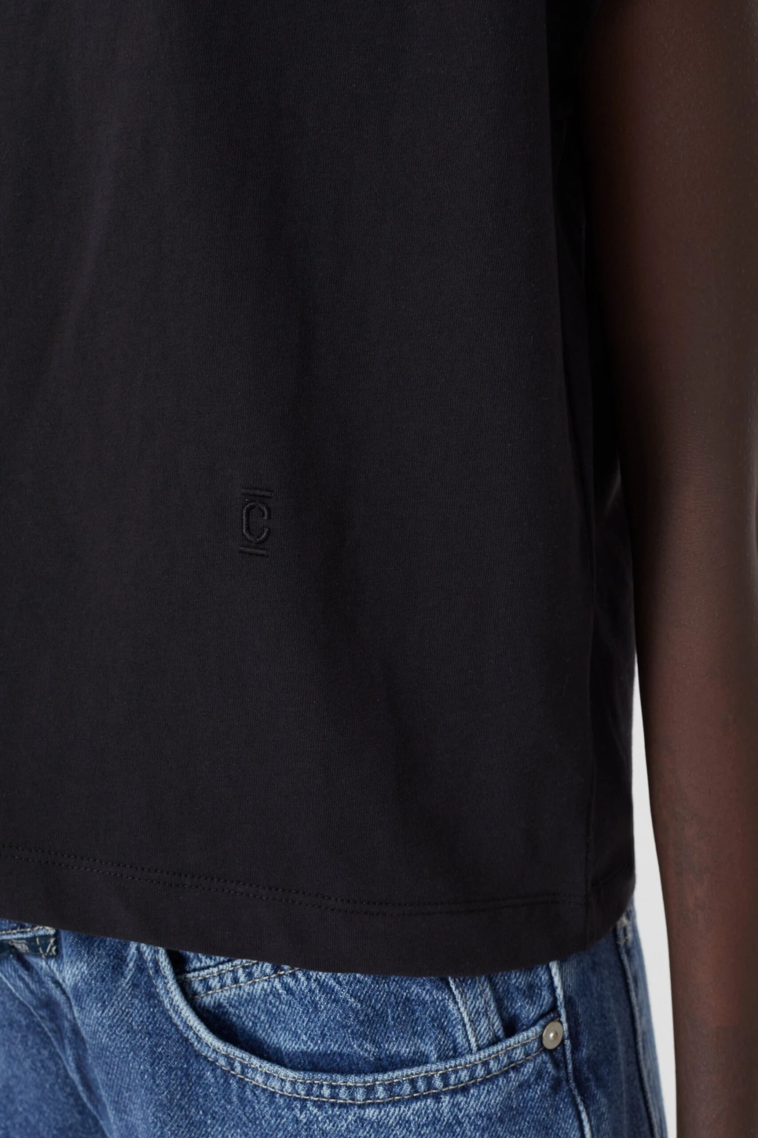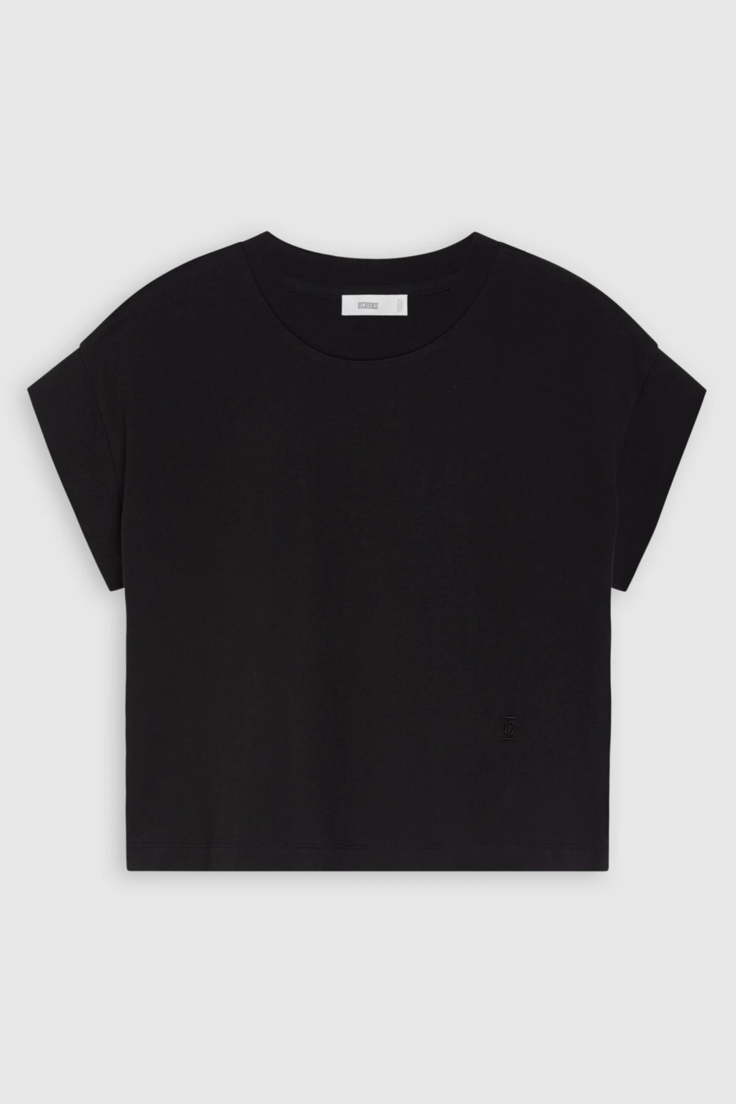Regular Fit aus reiner Bio-Baumwolle mit verkürzten Ärmeln: T-Shirt mit geripptem Rundhalsausschnitt und C-Stickerei auf der Vorderseite.