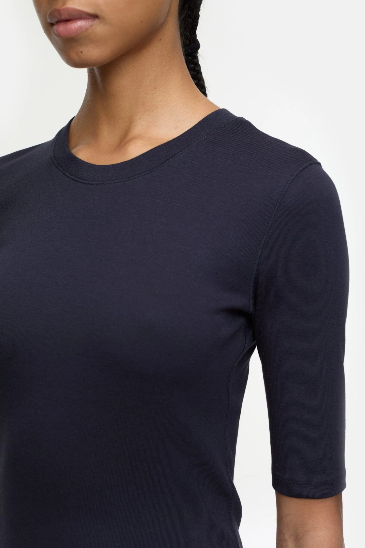 Schmal geschnittenes T-Shirt mit Rundhalsausschnitt aus weichem Baumwolle-Modal-Mix mit subtilem Glanz.
