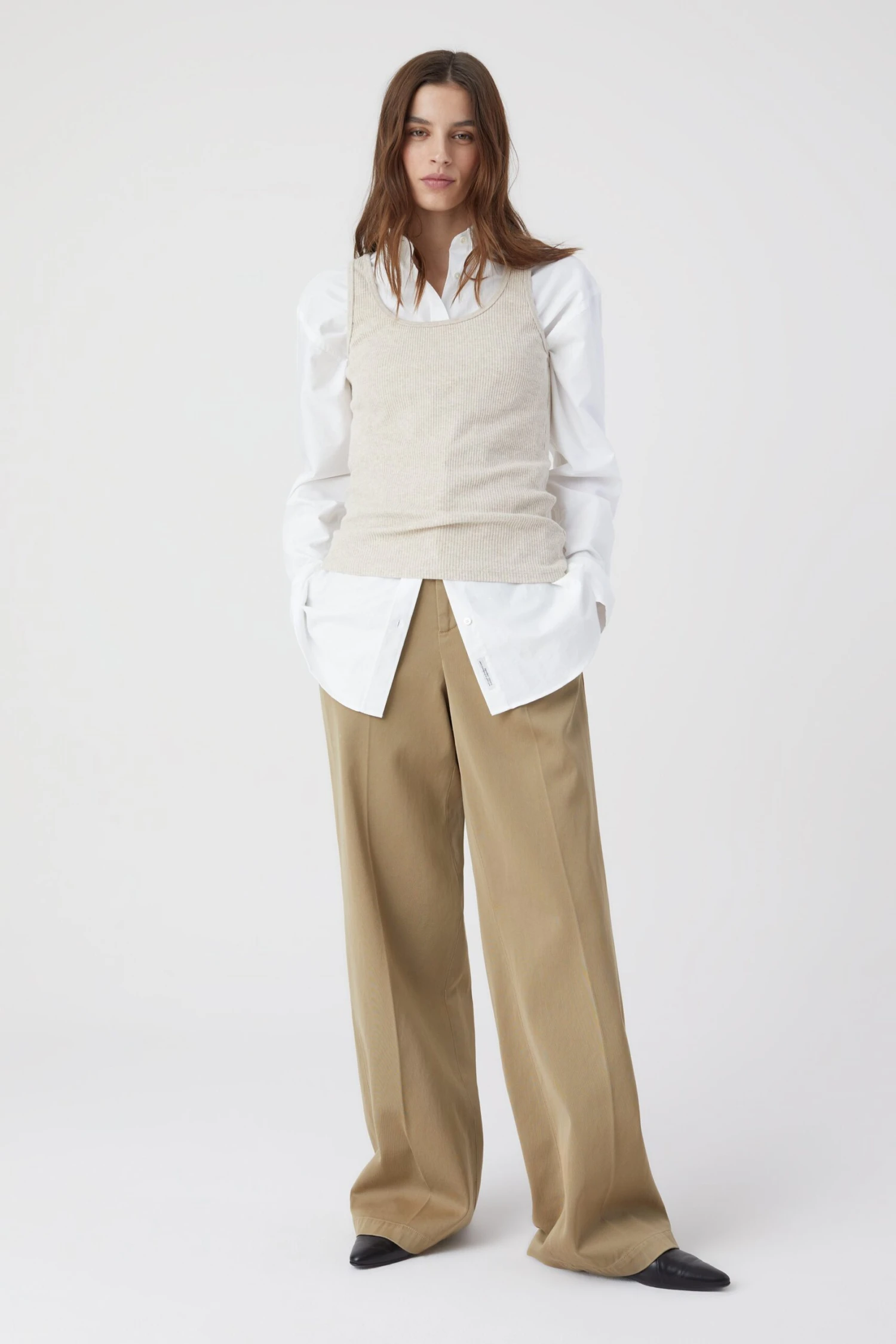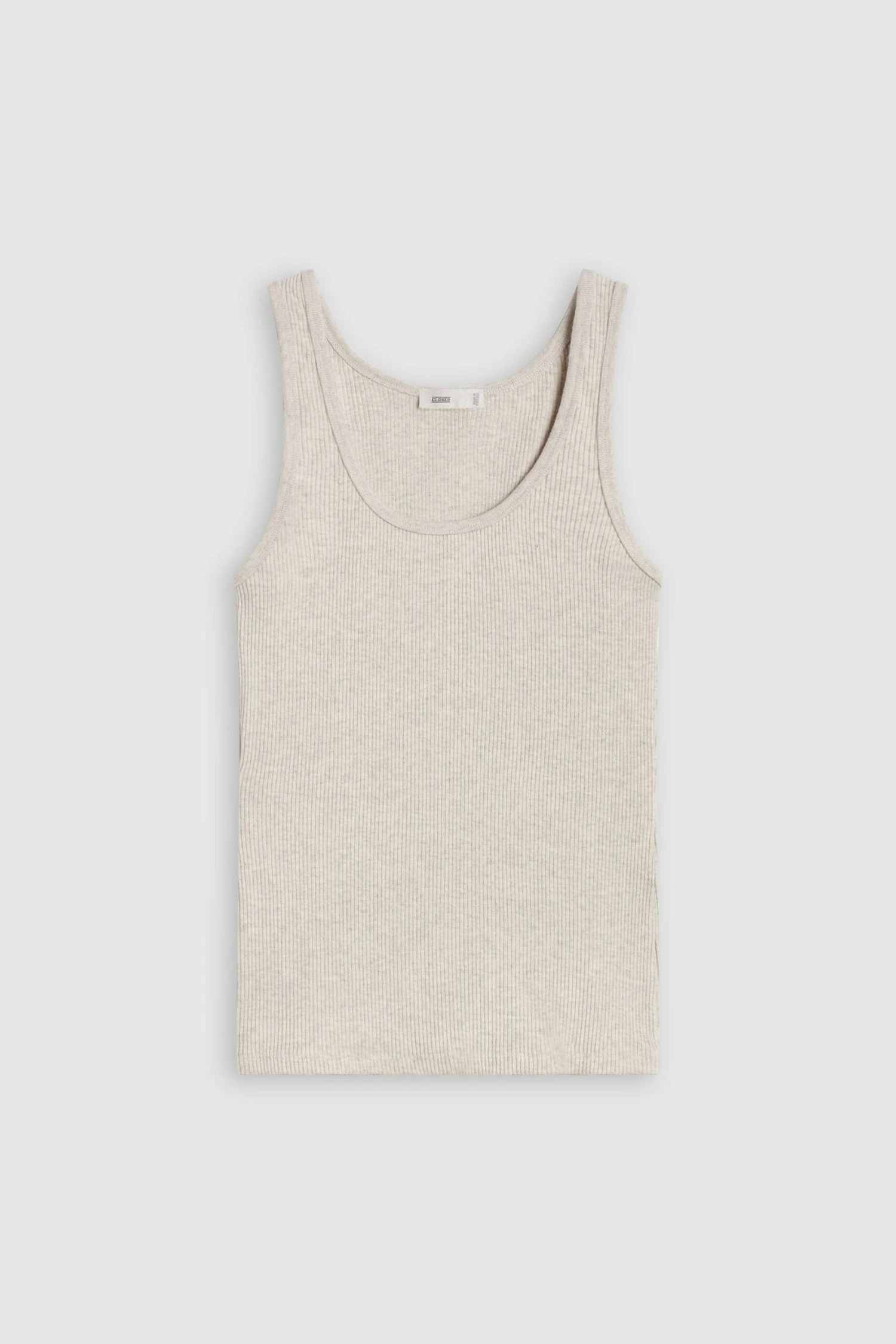 Fein geripptes Tanktop im Slim Fit mit Rundhalsausschnitt und geradem Saumabschluss. Aus weicher Qualität – gewebt aus recycelter Baumwolle, recyceltem Polyester und Elasthan