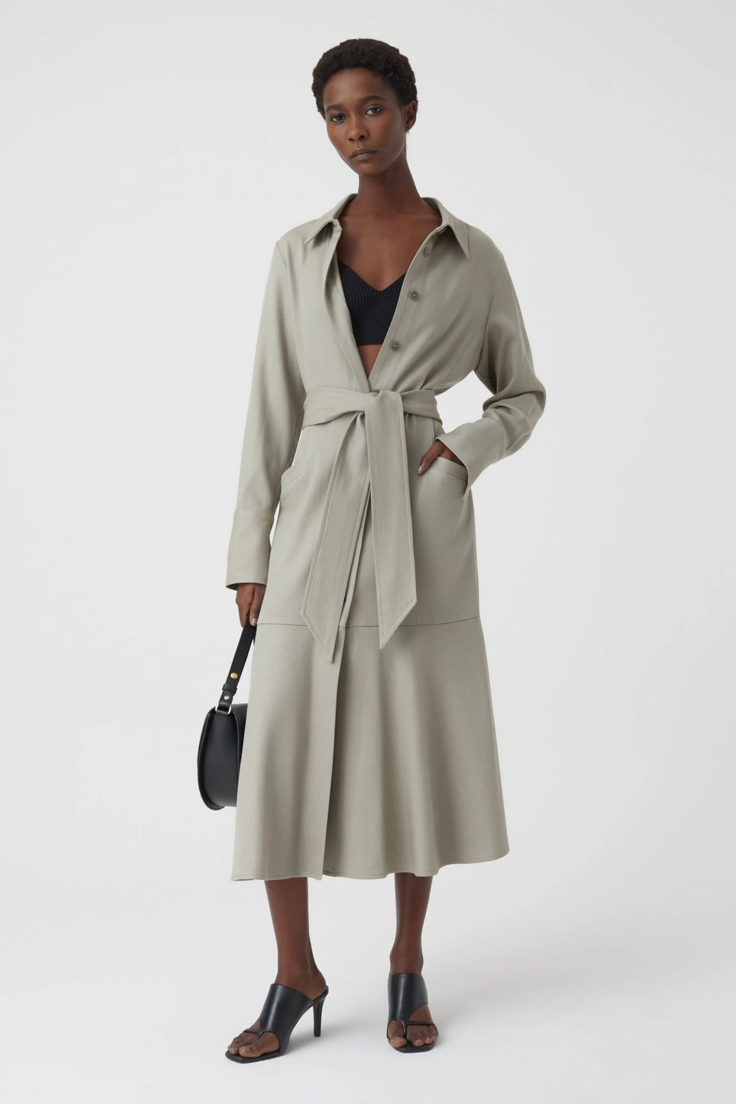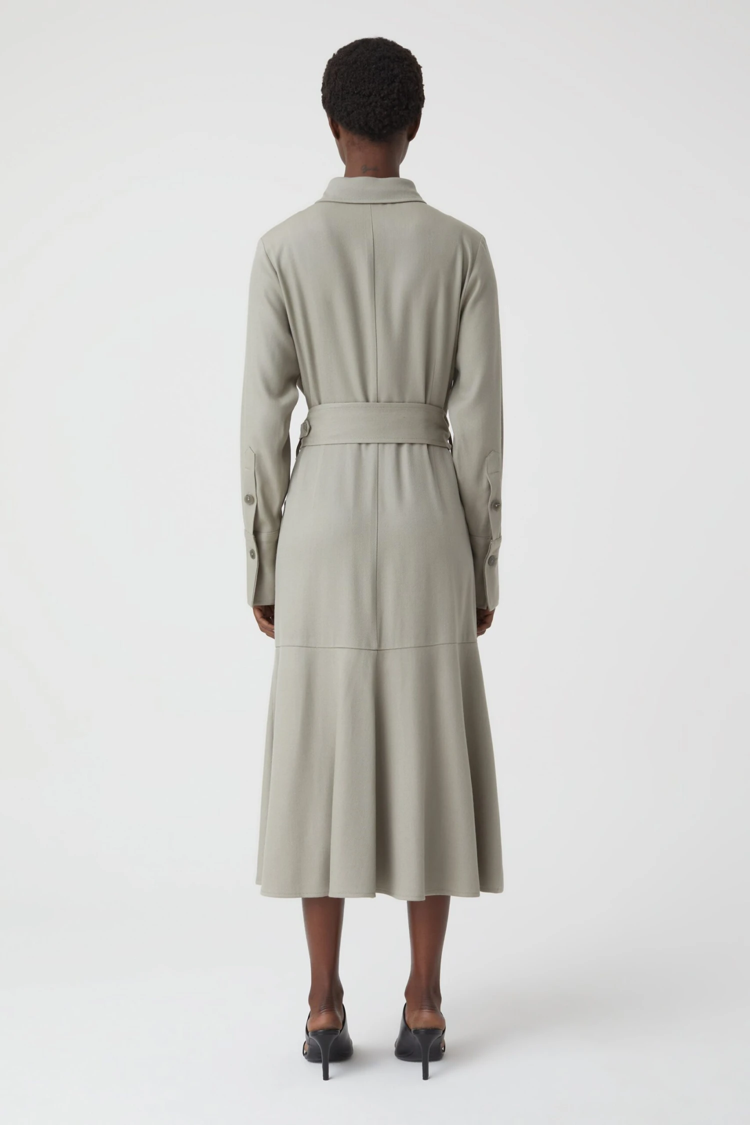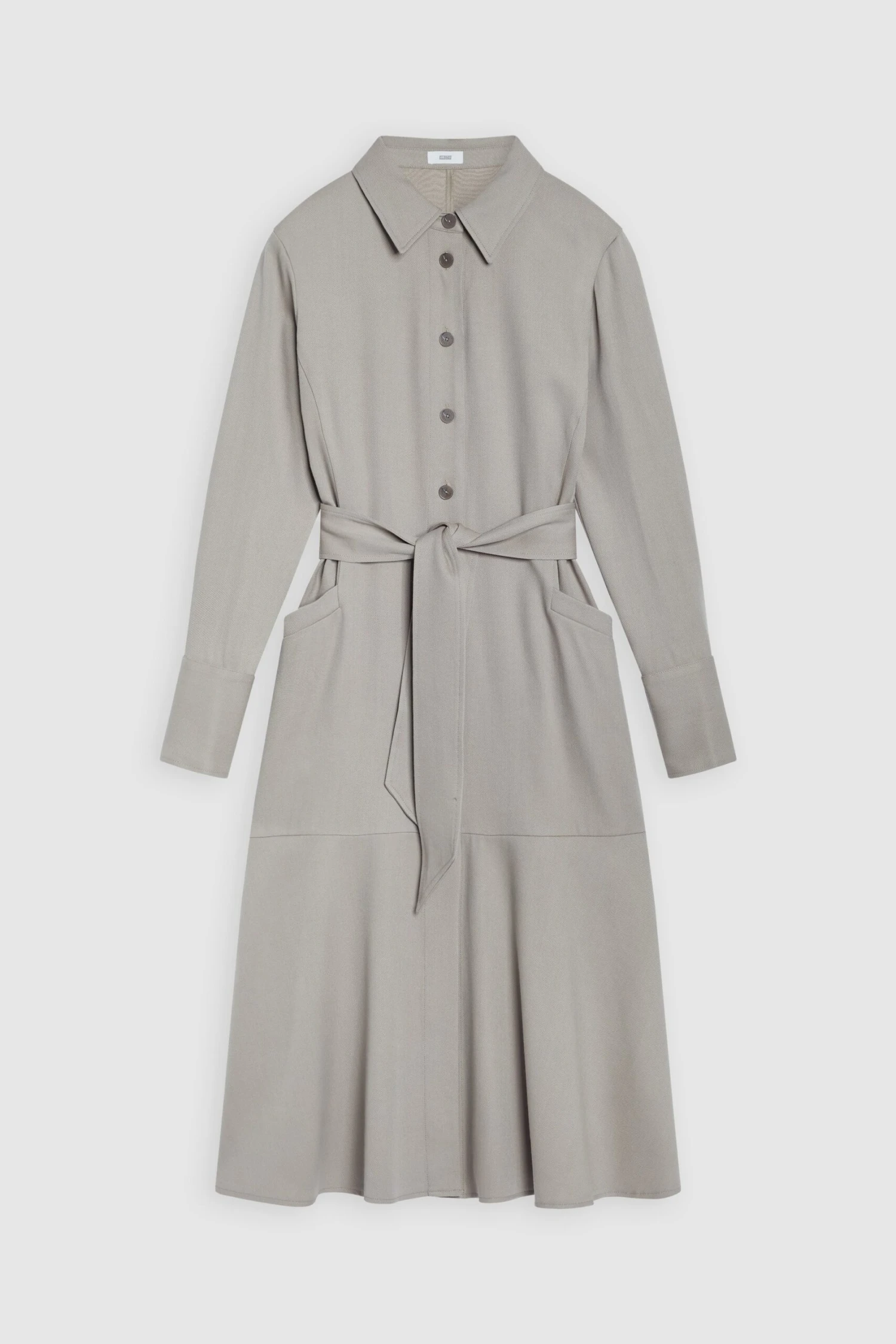Langärmeliges Kleid in A-Shape. Regular Fit mit festem Griff und Oberflächenstruktur. Mit Kragen, durchgehender Knopfleiste, Closed-Knöpfen und Taillengürtel. Dazu seitliche Schlitze am Saumabschluss.