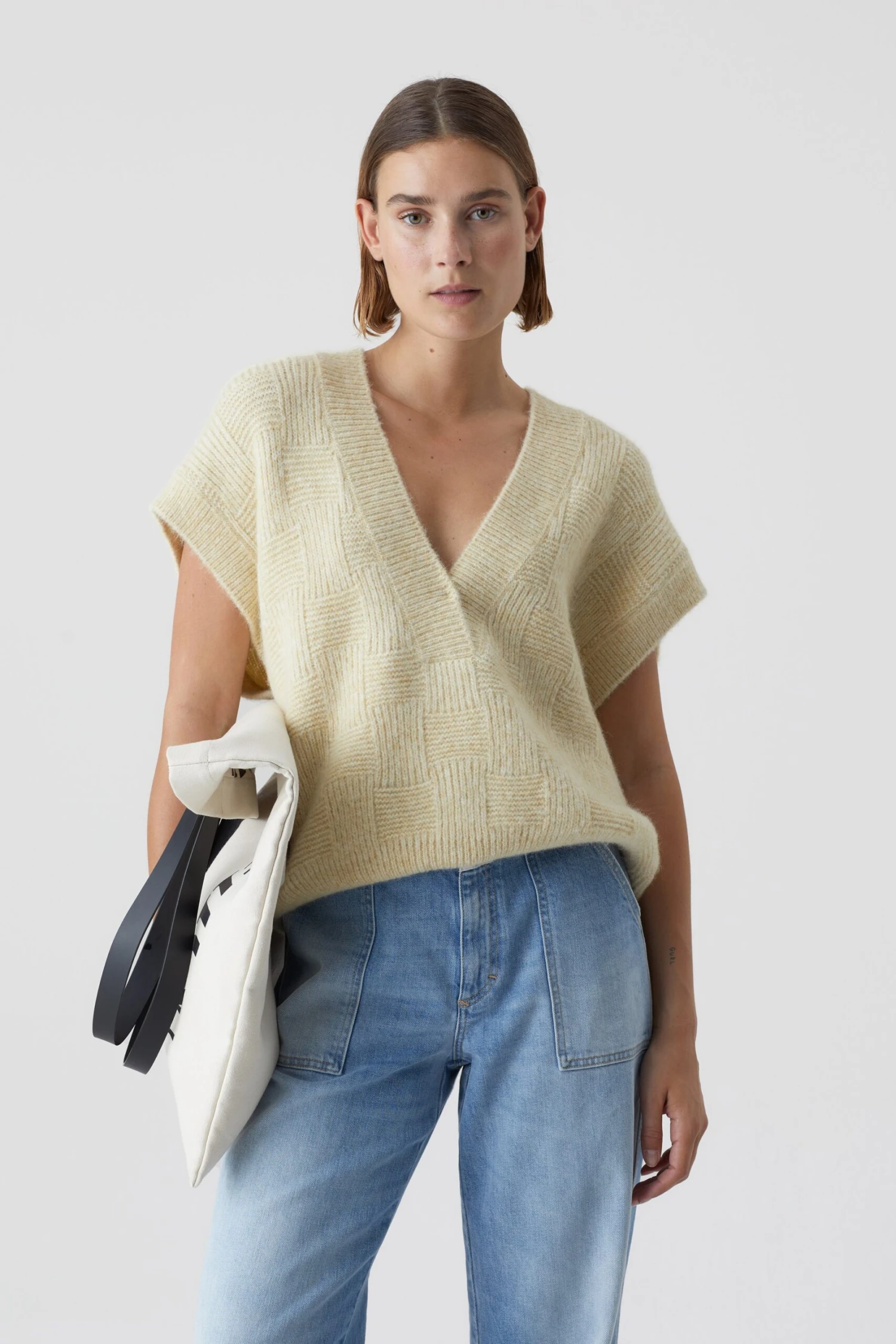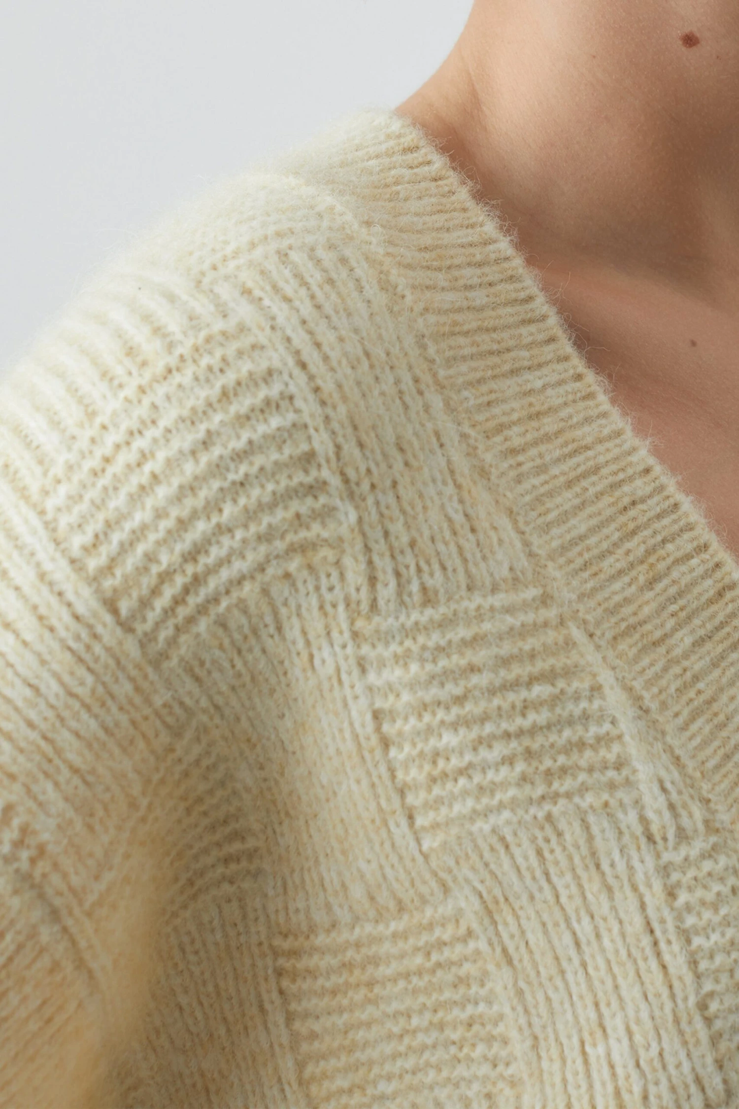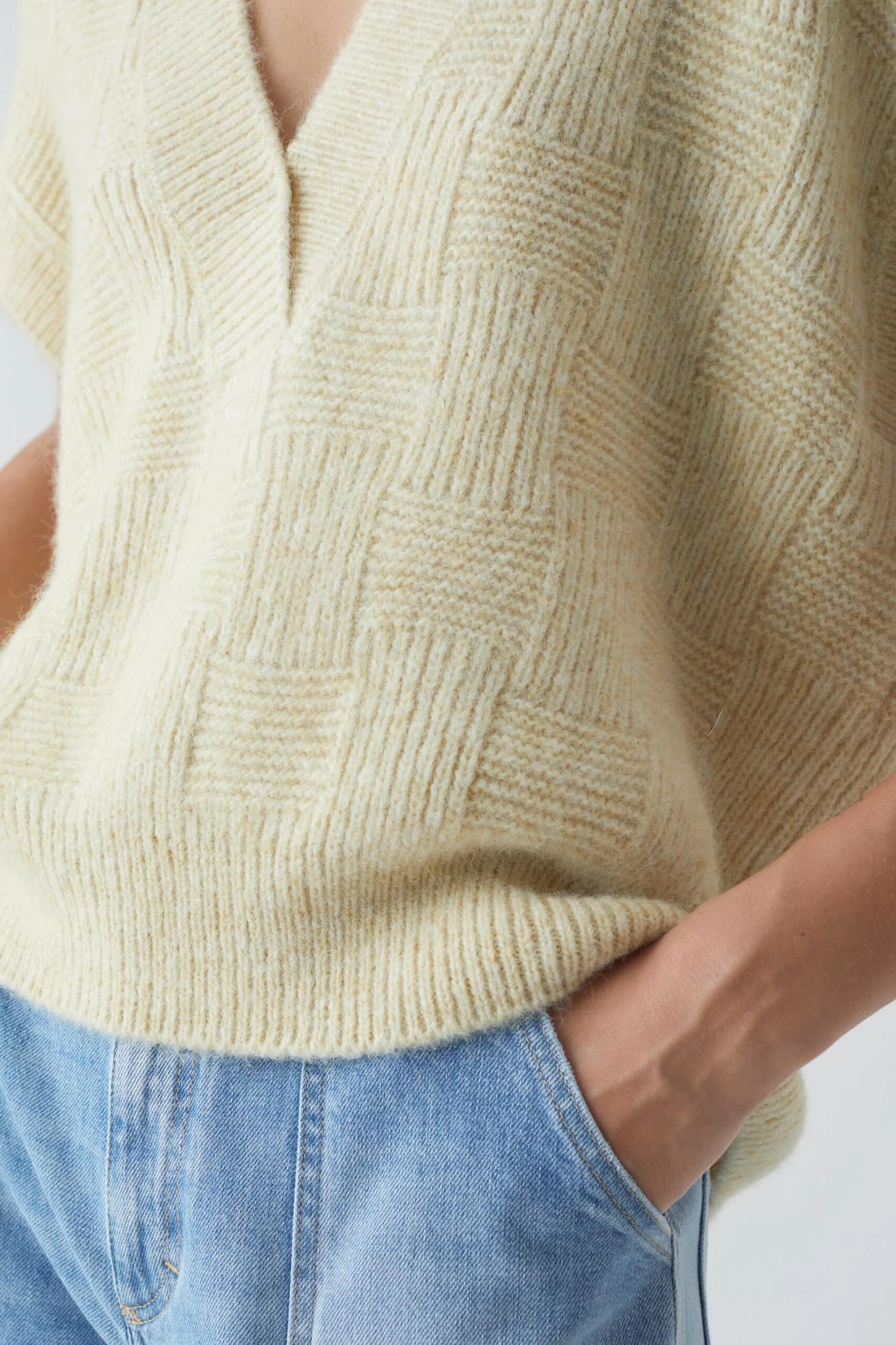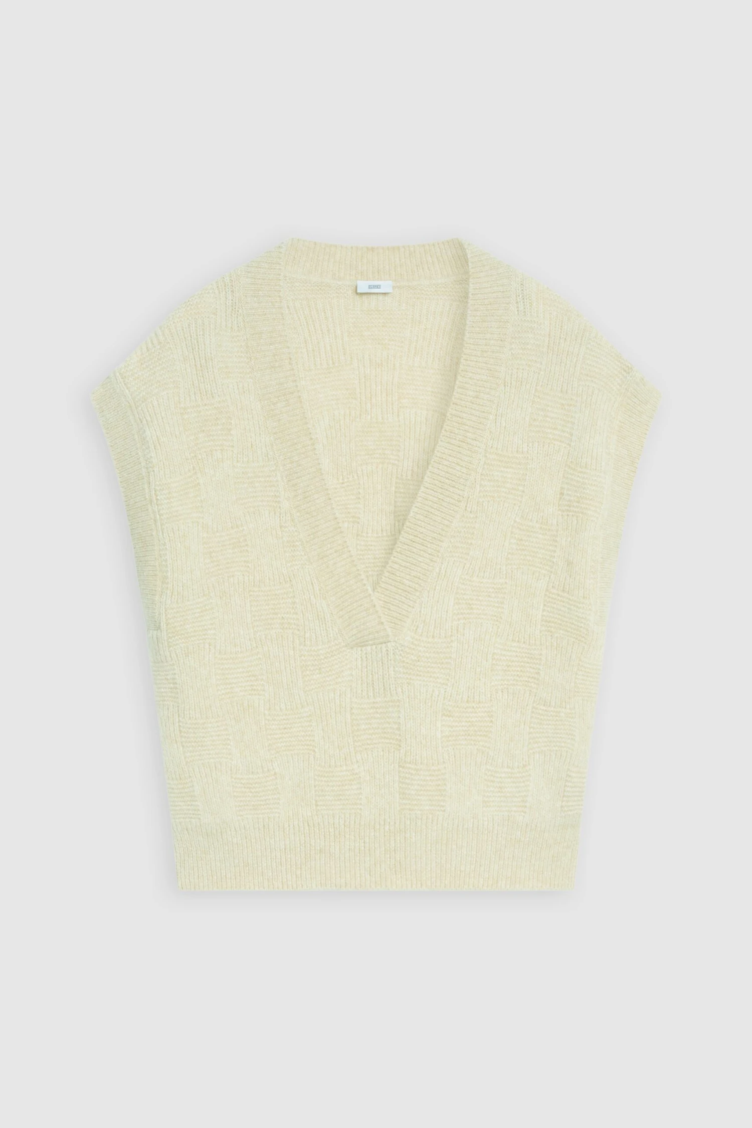 V-Pullunder mit Schachbrettmuster aus unterschiedlich gestricktem Alpaka-Mix-Garn – gesponnen im italienischen Traditionsbetrieb Pecci Filati. Boxy Fit mit breitem Bündchen am V-Ausschnitt.