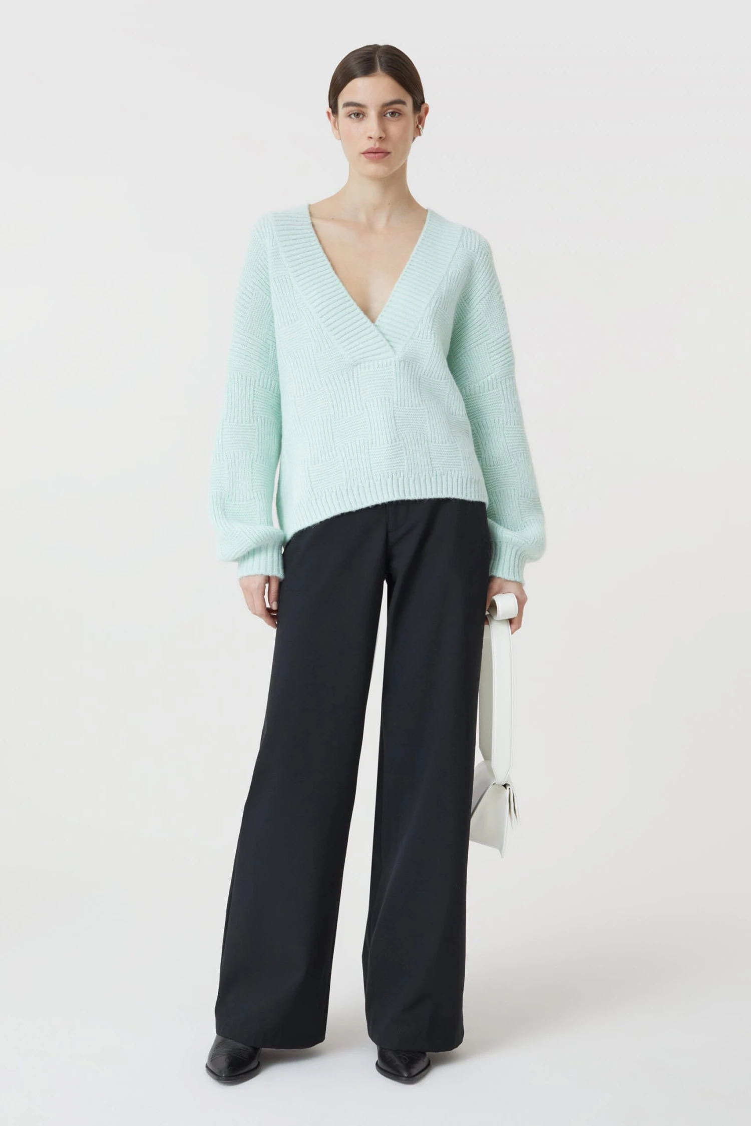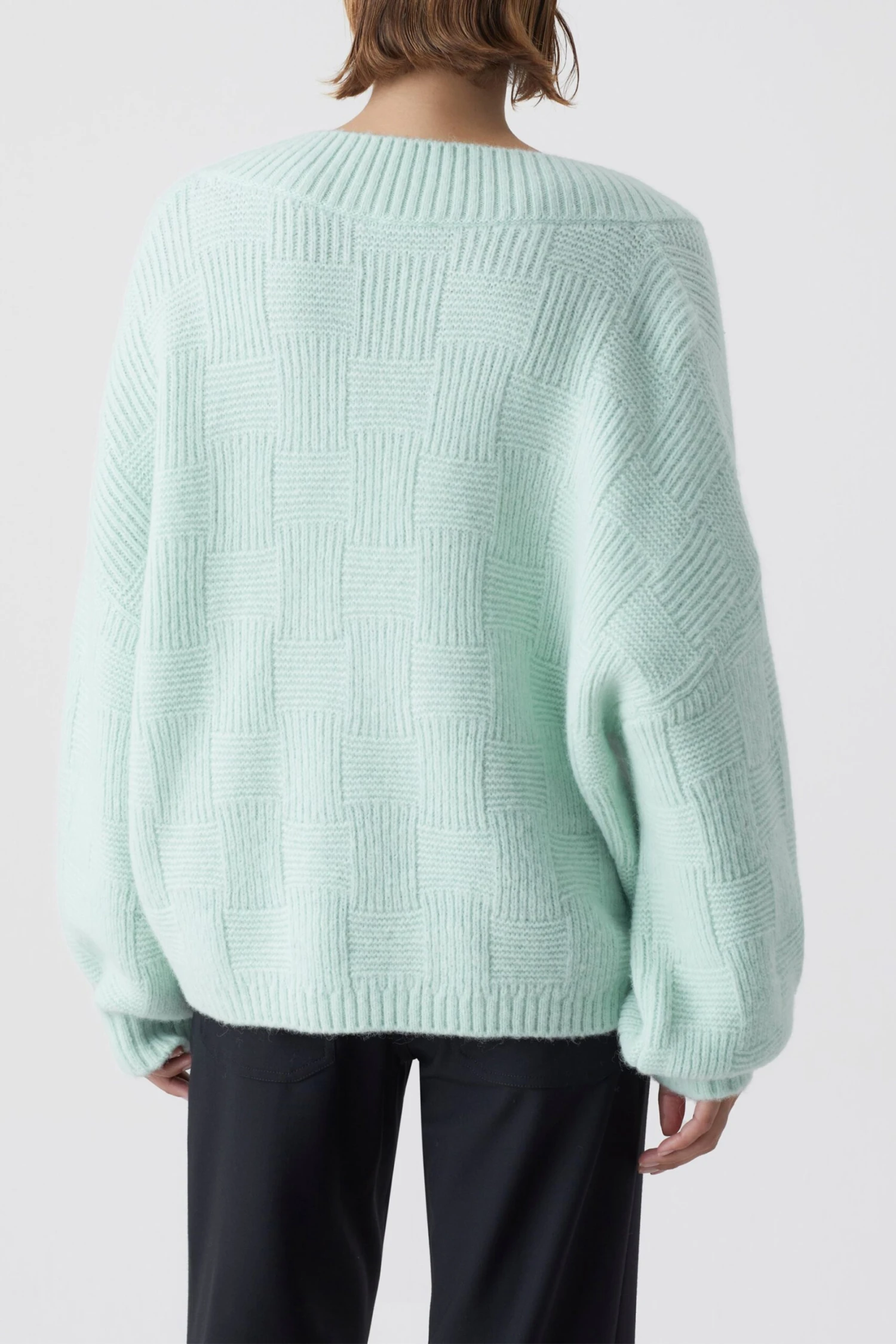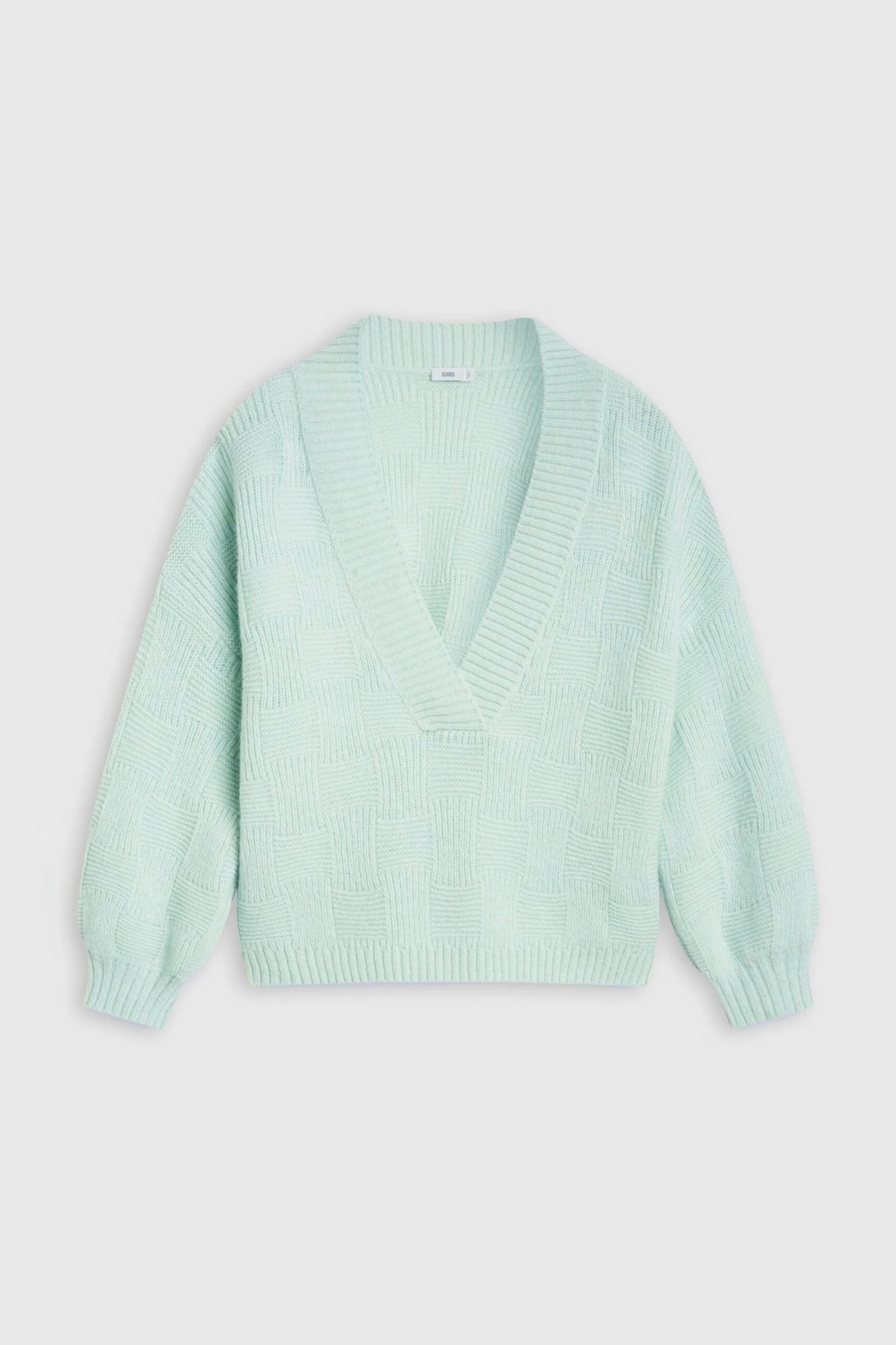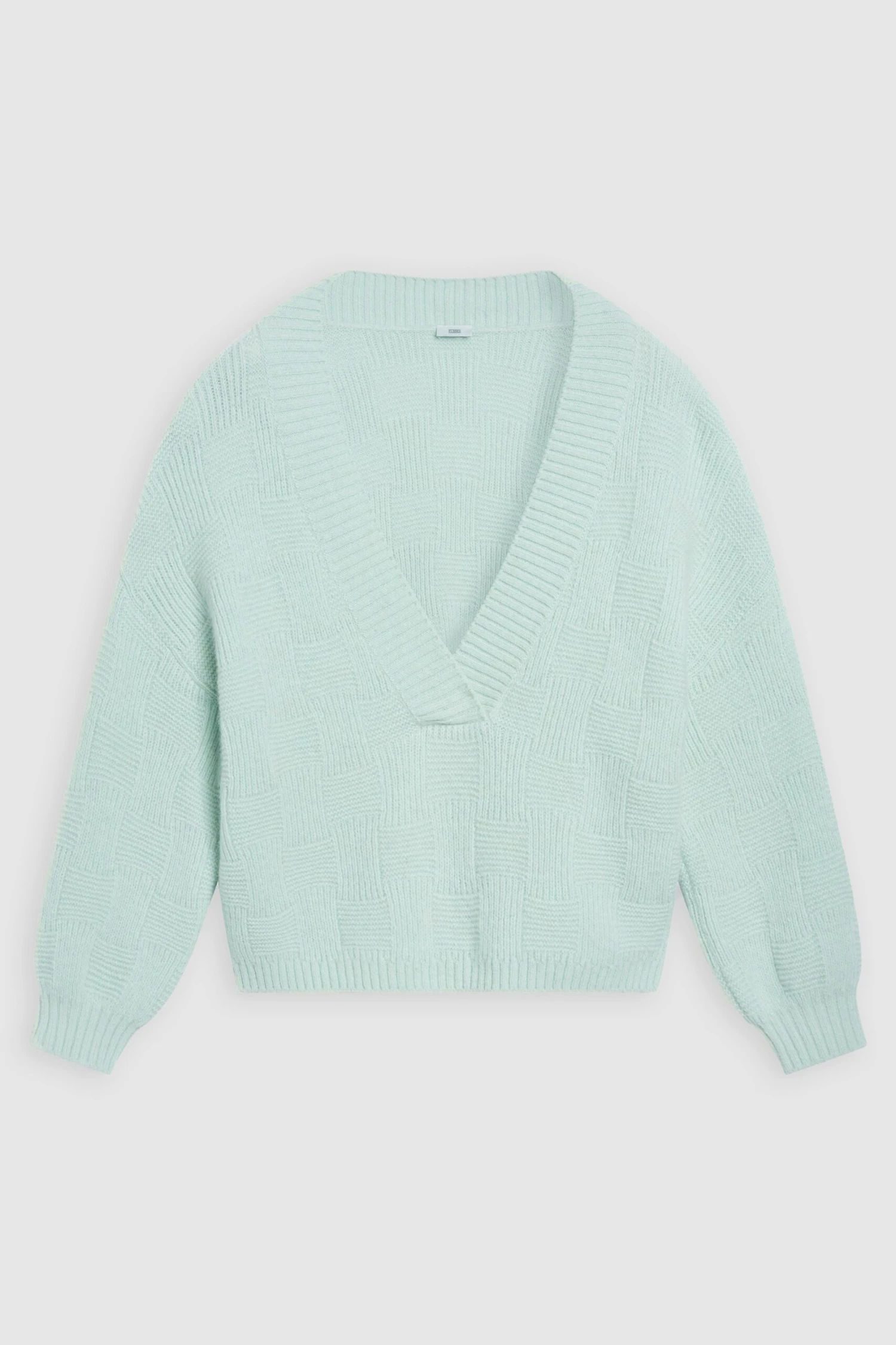 V-Pullover mit Schachbrettmuster aus unterschiedlich gestricktem Alpaka-Mix-Garn – gesponnen im italienischen Traditionsbetrieb Pecci Filati. Boxy Fit mit breitem Bündchen am V-Ausschnitt.