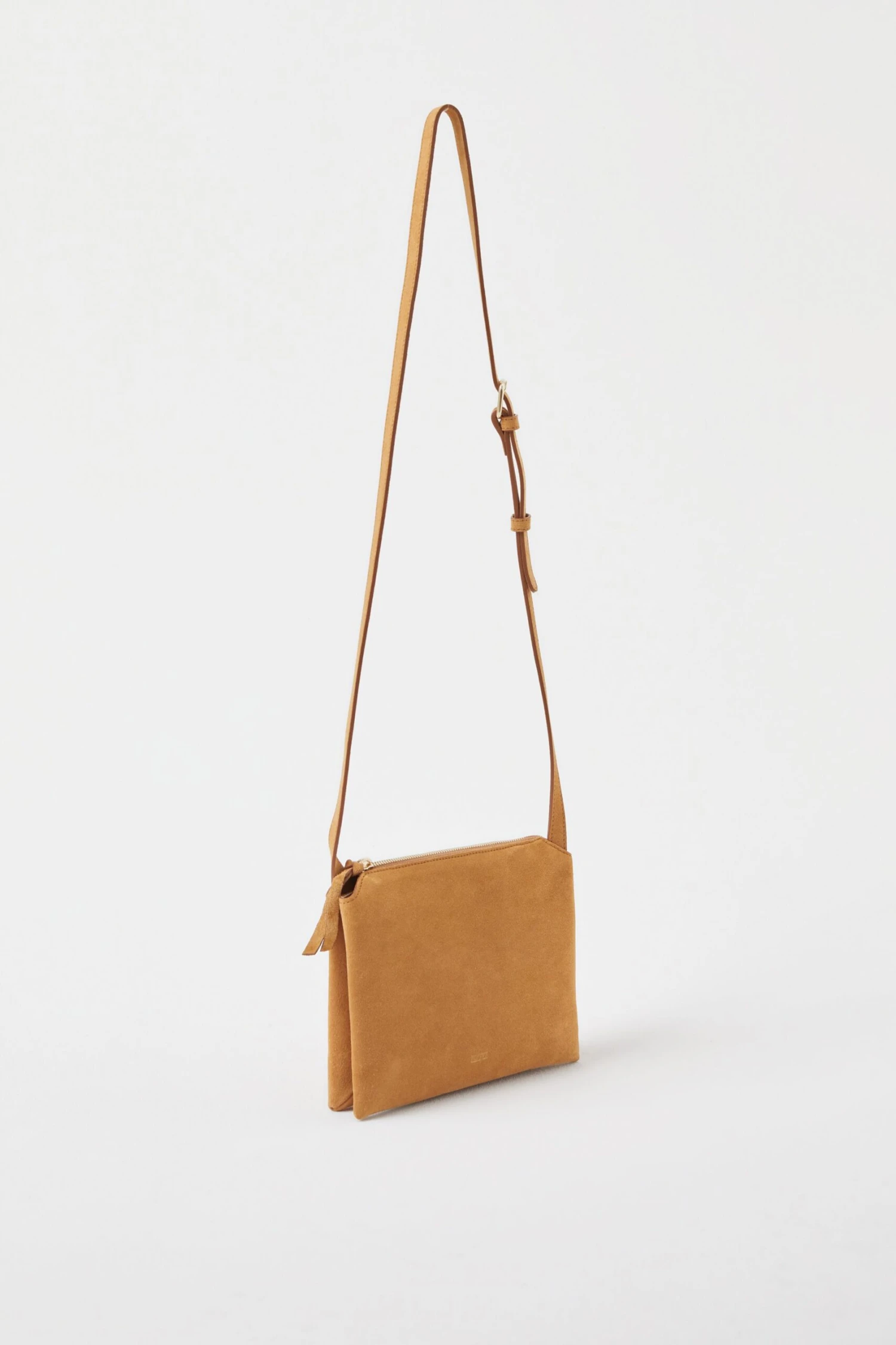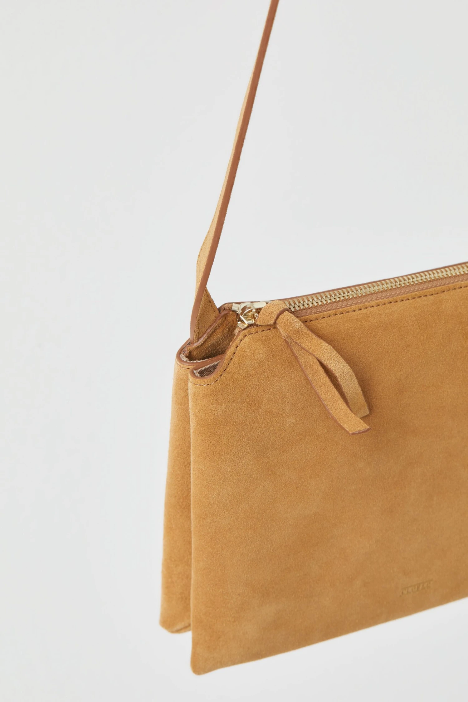 Aus weichem Veloursleder, gefertigt bei unseren Ledersepzialist:innen der Firma Daro’s in Portugal: Tasche mit zwei großen Fächern, einem Mittelfach, längenverstellbarem Riemen, Closed-Prägung und Twill-Futter.