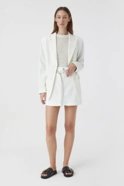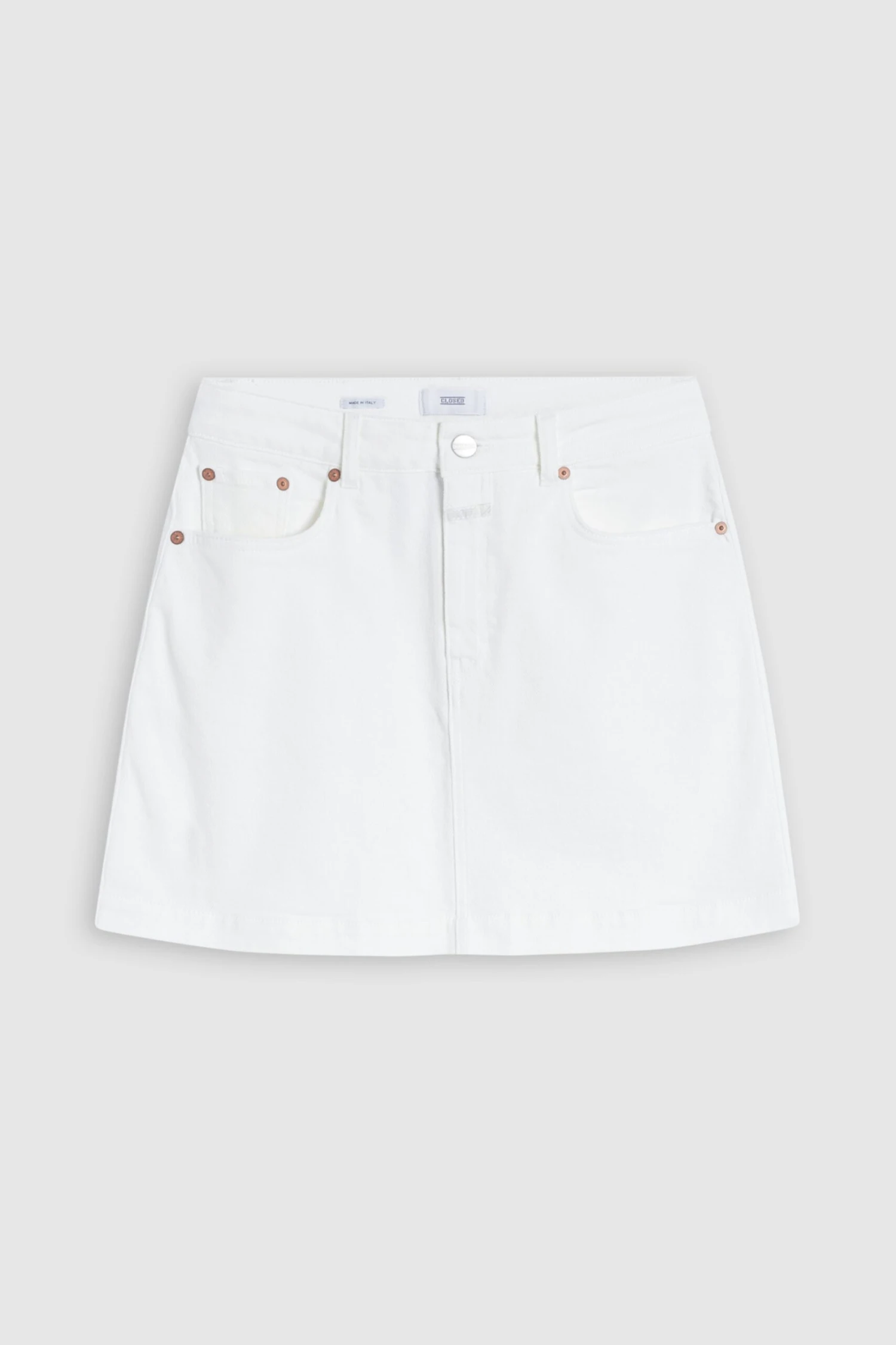 Mini im 5-Pocket-Style aus leichtem weißem Comfort Stretch Denim mit deutlicher Struktur und Fransensaum. Slim Fit mit Knopf, Zipper und Fly Label. Zu 100 Prozent in Italien gefertigt.