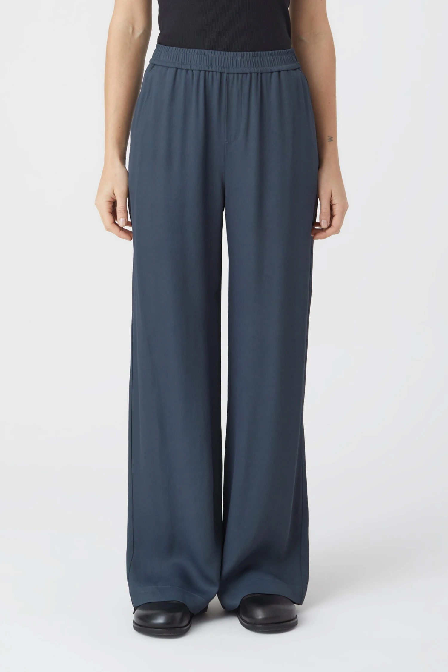 Style Winona im Wide Fit mit Stretchbund und seitlichen Eingrifftaschen. Gefertigt aus sehr leichtem und fließendem Twillstoff mit kühler Haptik. Zu 100 Prozent in Portugal gefertigt.