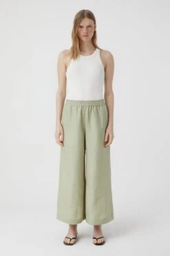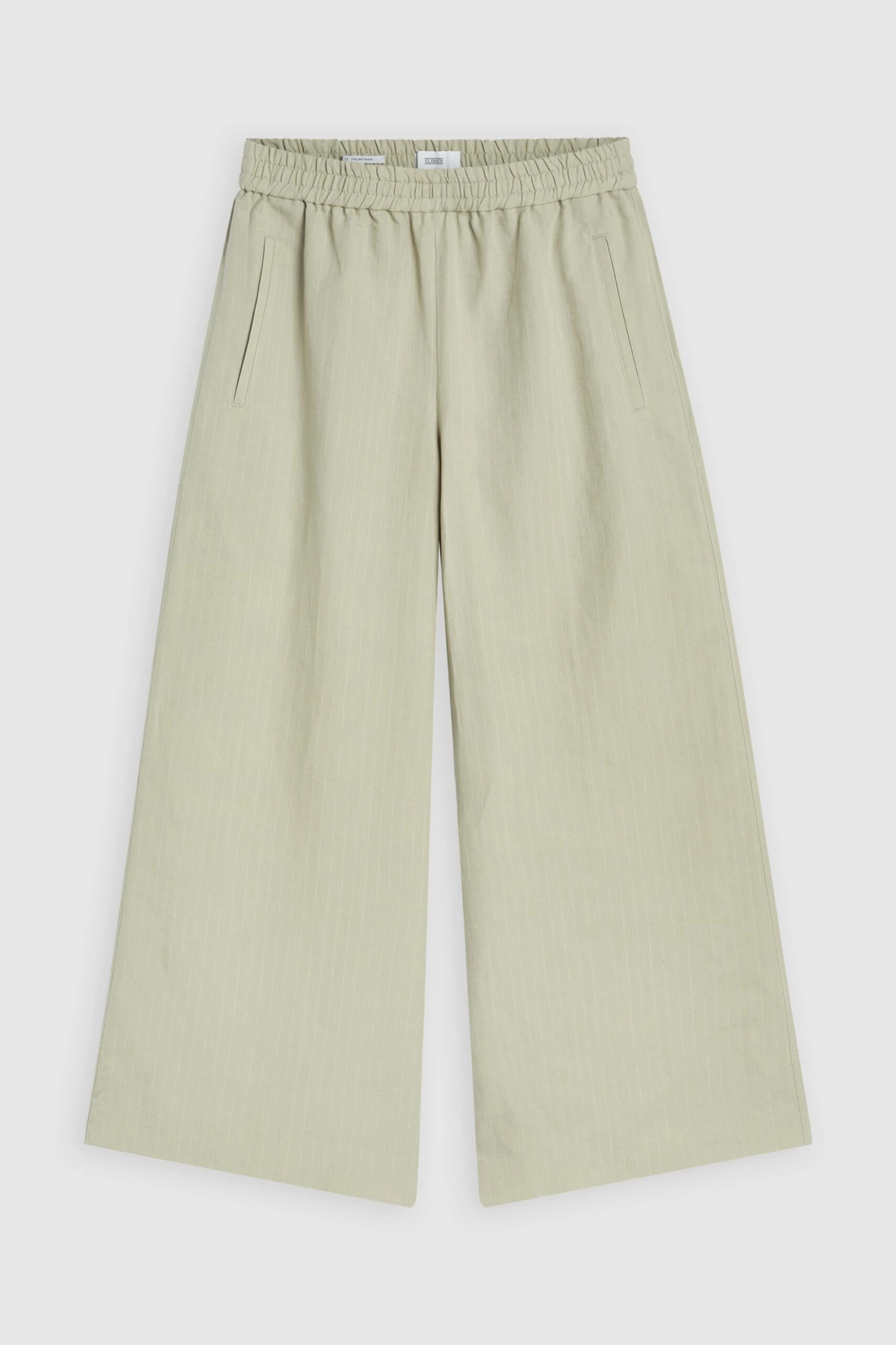 Style Wren im Wide Fit mit Stretchbund, seitlichen Eingrifftaschen und aufgesetzter Gesäßtasche. Aus weich fallendem italienischem Leinen-Mix mit feinen eingewebten Streifen und lebendiger Struktur.